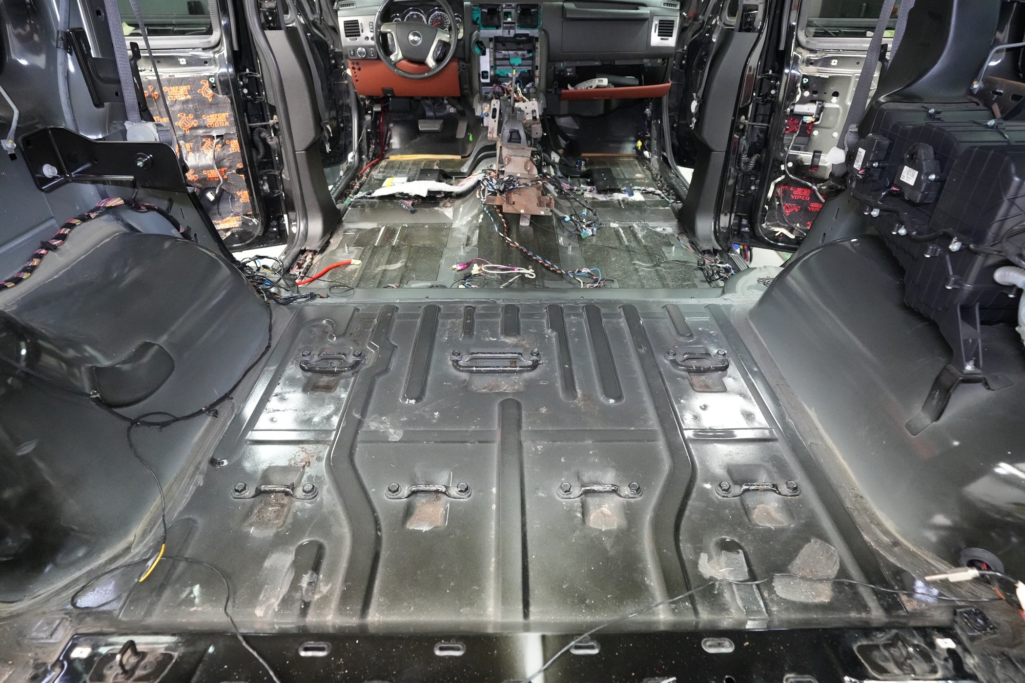 Odhlučnění vozu Hummer H2 začínáme obvyklým způsobem, tedy demontáží interiéru. Odstraníme všechny sedadla, veškeré čalounění a další komponenty, které nám mohou bránit při práci. Jak sami můžete vidět, plechy jsou až na bodovou aplikaci ochrany proti vibracím na podlaze zcela holé. Pouštíme se tedy do práce.