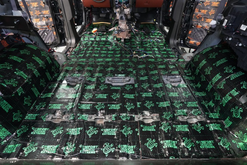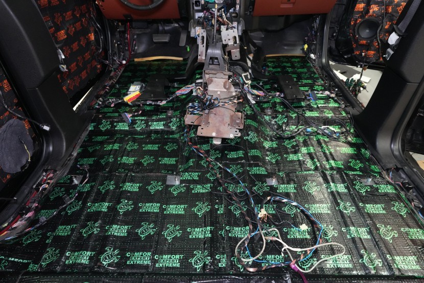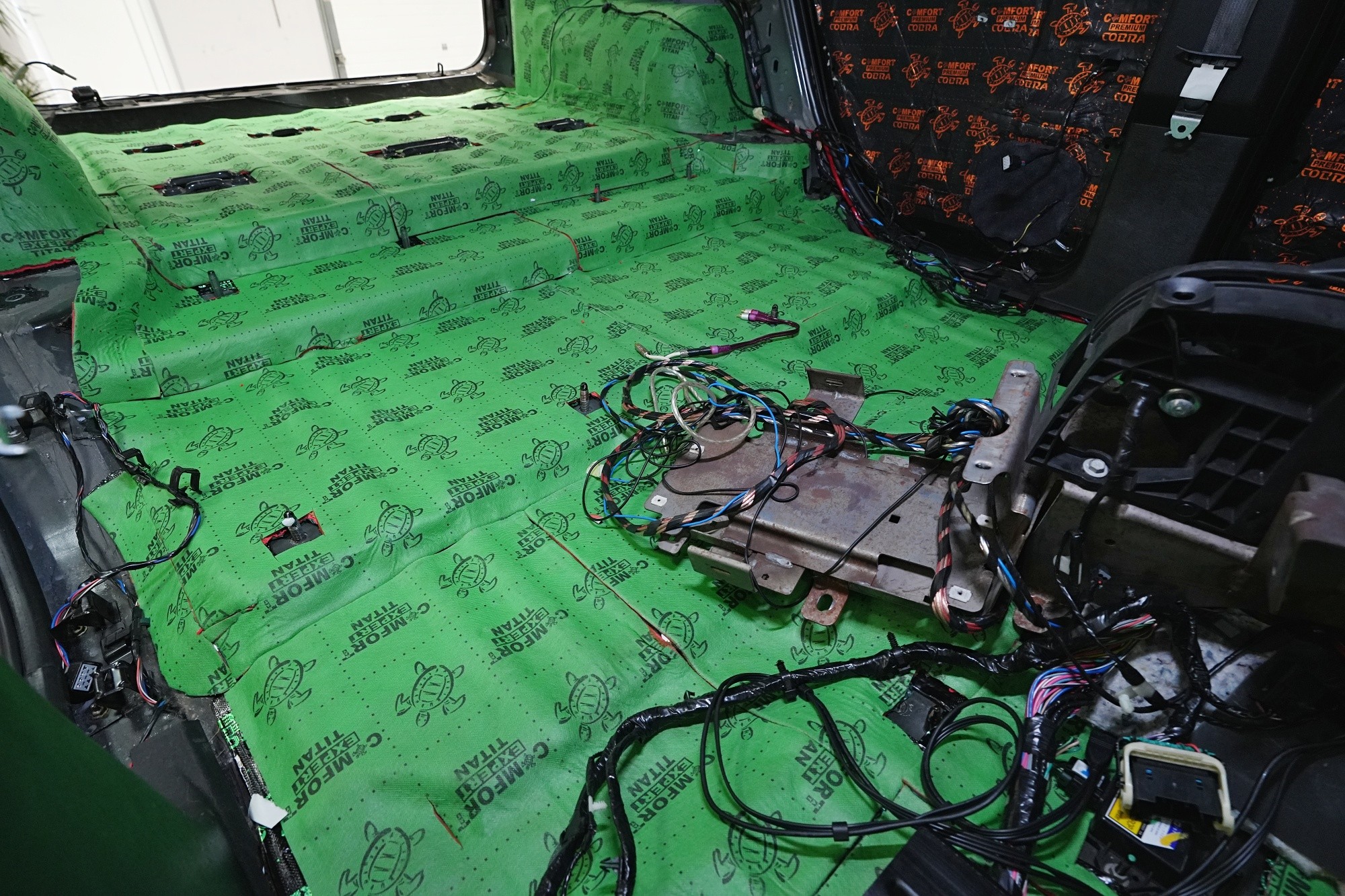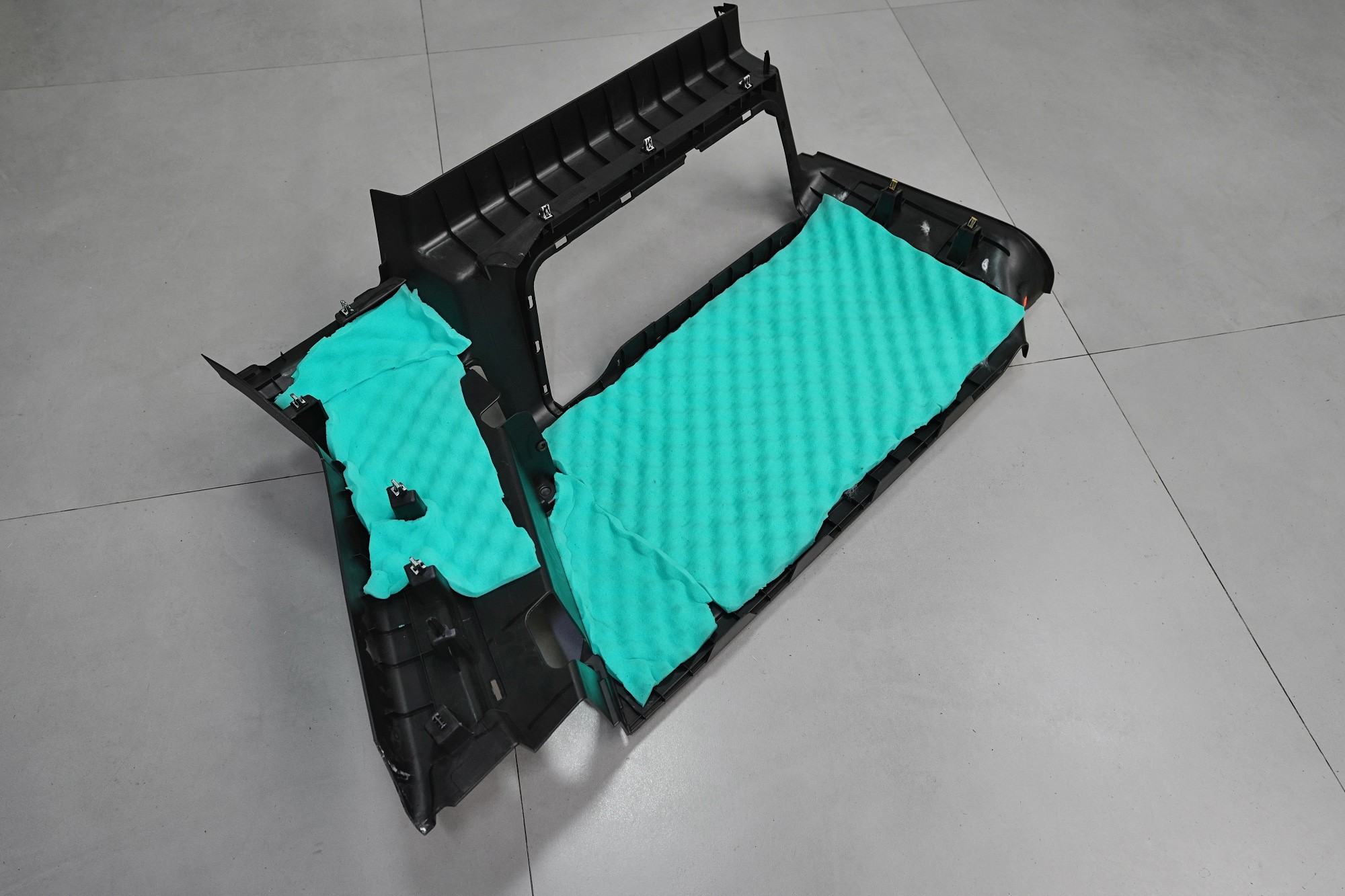K celkovému odhlučnění vozidla nejvíce přispívá důkladné odhlučnění podlahy, která je kvůli výrazným vibracím a hluku zejména o nízkých frekvencích nejvíce náročná na použití správných materiálů. I proto u balíčku Expert Plus používáme profesionální antivibrační materiál Comfortmat Extreme, který při své tloušťce pouhých 3,5 mm poskytuje akustický ztrátový činitel (MLF) 0,63 jednotek. To z něj dělá nejúčinnější antivibrační materiál na trhu o tloušťce do 4 mm a perfektně se tedy hodí do našich instalací zaměřených na maximální účinnost. Extreme jsme tentokrát použili i na zadní část vozu.
