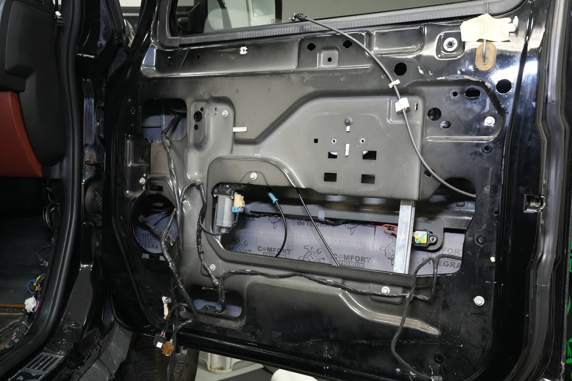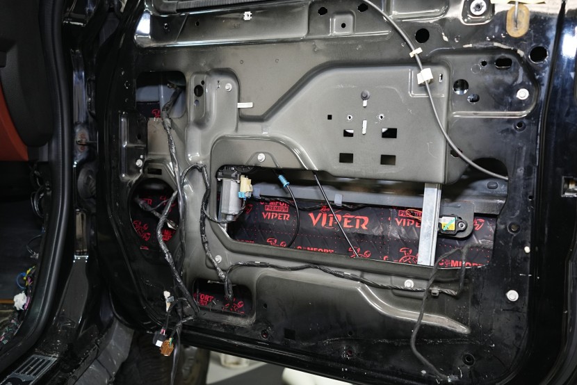 Dveře odhlučňujeme celkem v 5 vrstvách. Nejprve aplikujeme antivibrační materiál na vnější plech dveří, konkrétně Comfortmat Viper o tloušťce 3 mm. Ten s přehledem zlikviduje vibrace, zamezí pronikání nízkofrekvenčního hluku a zpevní velmi tenký plech dveří. I přes vyšší tloušťku materiál disponuje velmi nízkou hmotností, je samozřejmě voděodolný a má mimo jiné antikorozní vlastnosti.