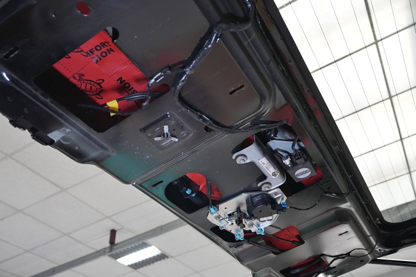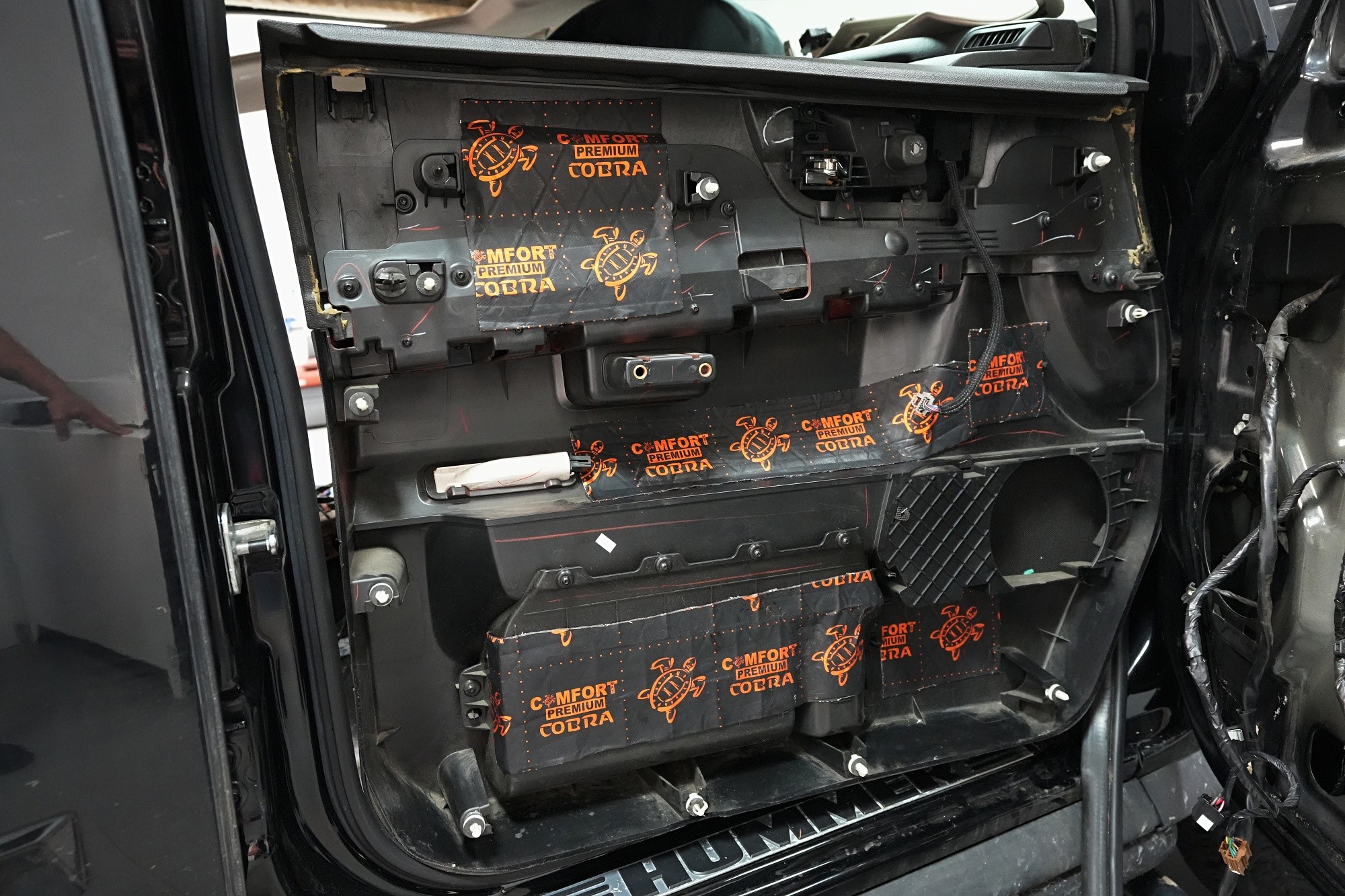 Kompletní odhlučnění vozu Hummer H2, včetně demontáže a odhlučnění palubní desky. Hummer H2 je civilní verzí původně armádního vozidla, které se díky svým specifickým vlastnostem stalo zejména v USA velkým hitem své doby. Mezi největší nedostatky vozu patří vysoká hladina hluku v interiéru a velký problém přestavuje i nepříjemné vrzání snad veškerých interiérových plastů, které se připomenou po přejetí jakékoliv nerovnosti. Hummer nemá vůbec žádné tovární odhlučnění a pod tenkou vrstvou koberce se nachází rovnou holý plech. Od vozu s takovým motorem, hlasitými laděnými výfuky a obrovskými koly nelze čekat nic jiného než pořádný randál v interiéru. Zadání bylo jasné - zbavit tento vůz v co největší míře všudypřítomného hluku. Zvolili jsme náš balíček Expert Plus s pár úpravami pro ještě vyšší účinnost. Netradičně jsme na kompletní podlahu i zadní část vozu použili ve dvou vrstvách Comfortmat Extreme a Titan, což jsou v daných tloušťkách nejúčinnější materiály na současném trhu. Konkrétně jsme tedy odhlučnili přední, zadní i páté dveře, podlahu, zadní prostor, přední a zadní zadní podběhy z vnitřní strany, střechu, kapotu a velkou péči jsme věnovali i palubní desce. Všechny důležité oblasti vozu jsou odhlučněny moderními dvouvrstvými materiály a ve výsledku jsou tedy aplikovány čtyři vrstvy odhlučnění s rozdílnými vlastnostmi. Na odhlučnění pracovalo pět našich techniků, kteří montáž zvládli v rámci 2 pracovních dnů. Více informací se dozvíte v naší podrobné fotoreportáži.