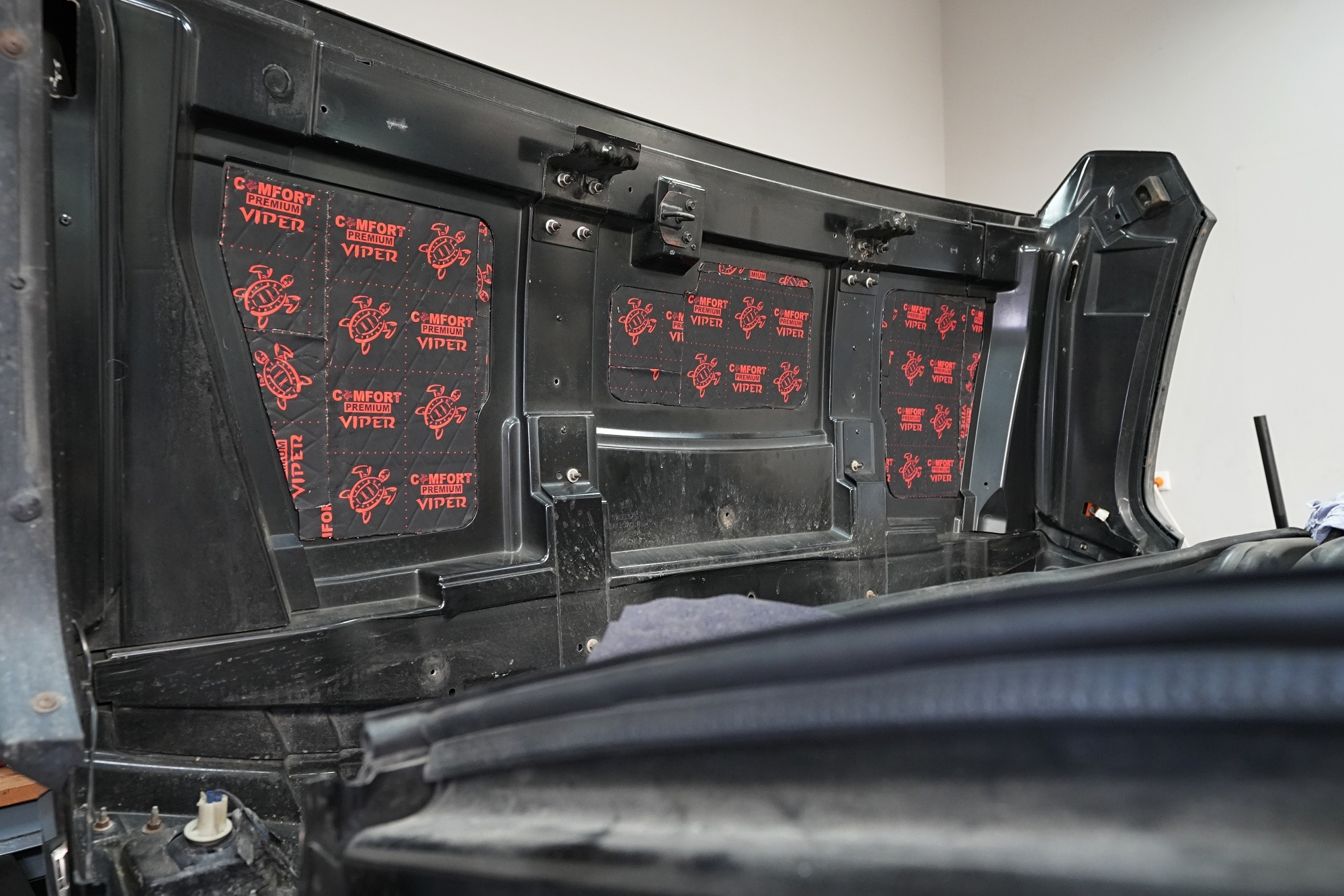 Věnujeme se samozřejmě i pátým dveřím, aby odhlučnění zavazadlového prostoru bylo kompletní. Jako první vrstvu volíme lehký antivibrační materiál Comfortmat Viper o tloušťce 2,3 mm, který zamezí vibracím a nezatěžuje páté dveře zbytečnou hmotností.