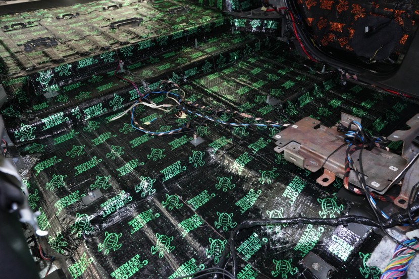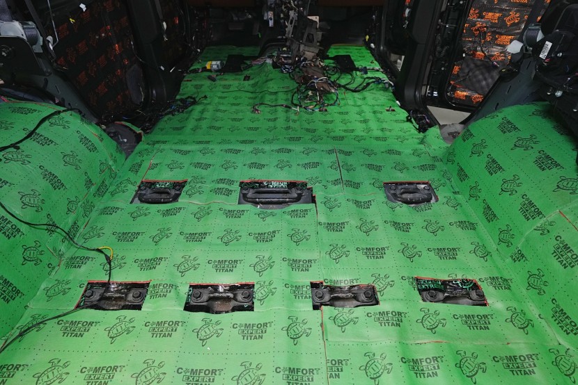 Titan spolu s Extremem aplikujeme na všechny přístupné oblasti, abychom umožnili izolaci maximálního množství vibrací a hluku. V přední části podlahy se dostáváme až pod palubní desku, díky čemuž důkladně odhlučníme i přední podběhy z vnitřní části vozu, kde je přístup k větší ploše karoserie. Podlahu tedy odhlučňujeme vysoce účinným antivibračním materiálem o tloušťce 3,5 mm a zvukově izolačním materiálem v druhé vrstvě o tloušťce 8 mm. Celkem tedy téměř 12 mm zvukové izolace, což má za následek důkladné zamezení hluku od předních pneumatik i bez aplikace z vnější strany.