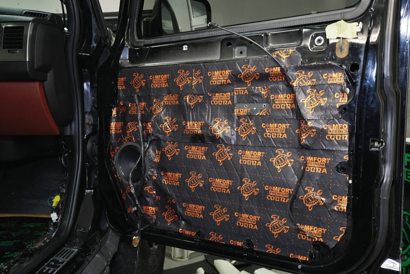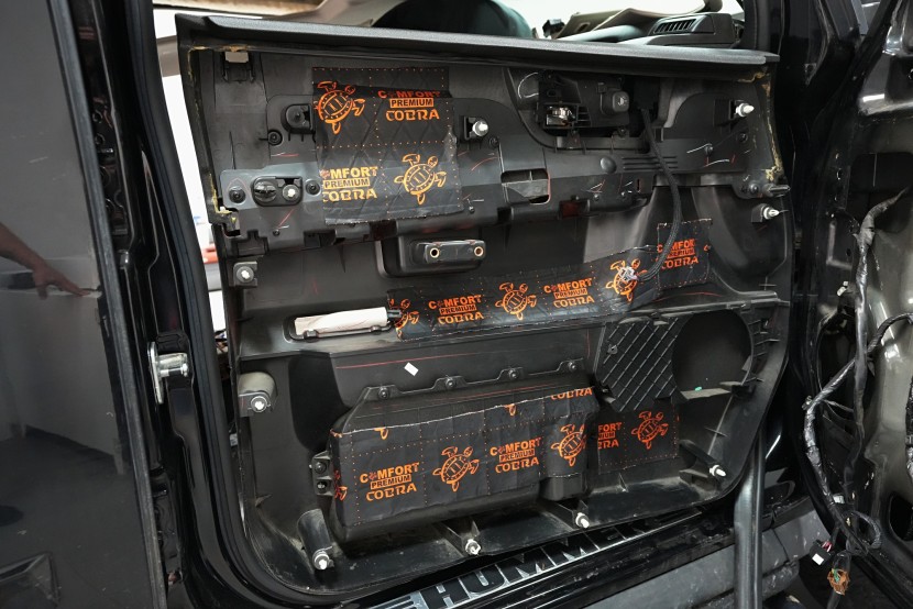 Následně aplikujeme antivibrační materiál Comfortmat Cobra, který se pyšní nejnižší hmotností ze všech antivibračních materiálů na trhu v dané tloušťce 2,3 mm. Tato vrstva slouží k zamezení vibrací a rezonancí vnitřního plechu dveří a u většiny vozidel i k vytvoření uzavřené ozvučnice pro reproduktory, což má za následek zlepšení ozvučení. Zejména basová složka středobasového reproduktoru dozná podstatného zlepšení, což oceníte jak u továrních, tak aftermarket reproduktorů.