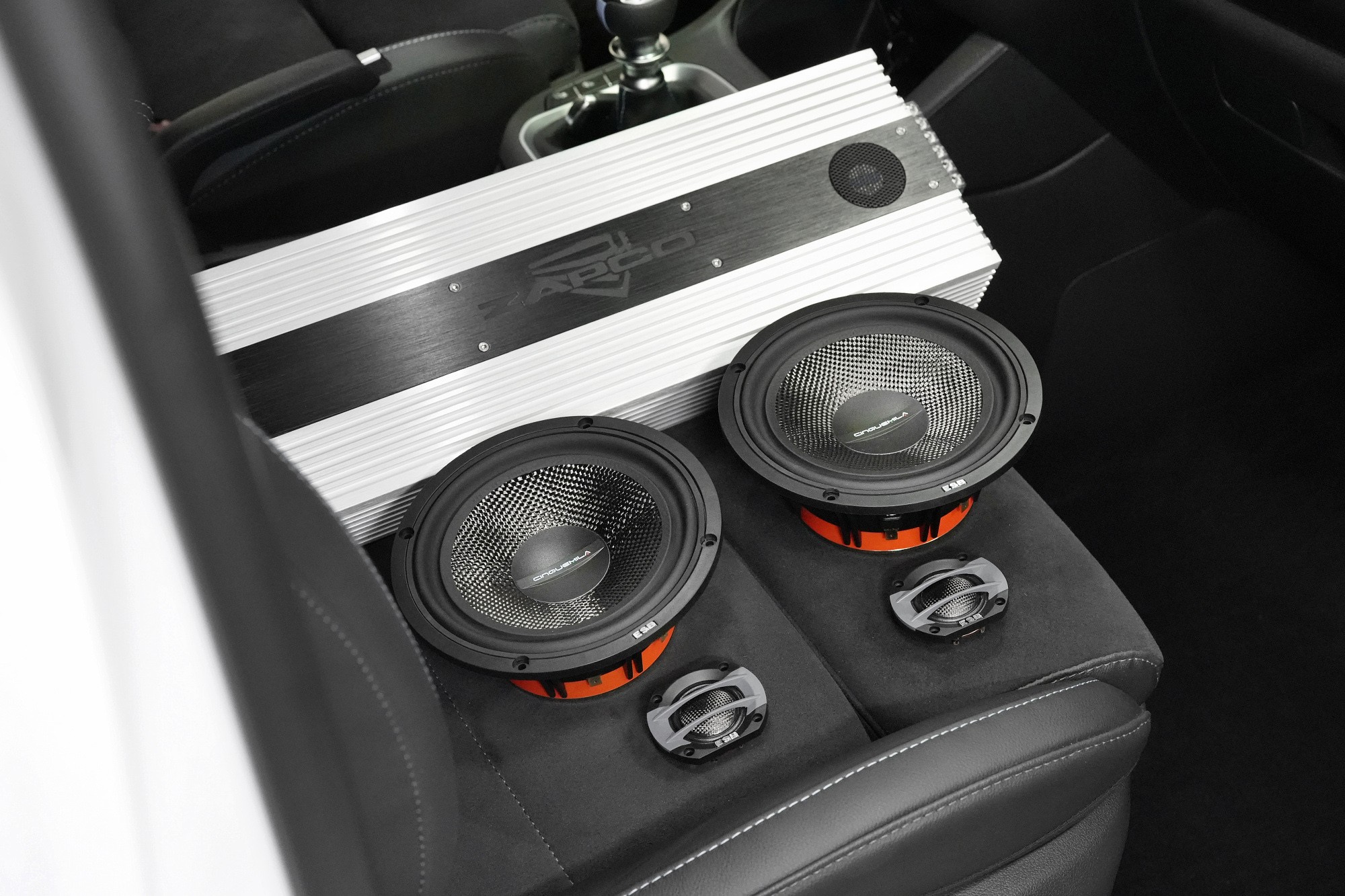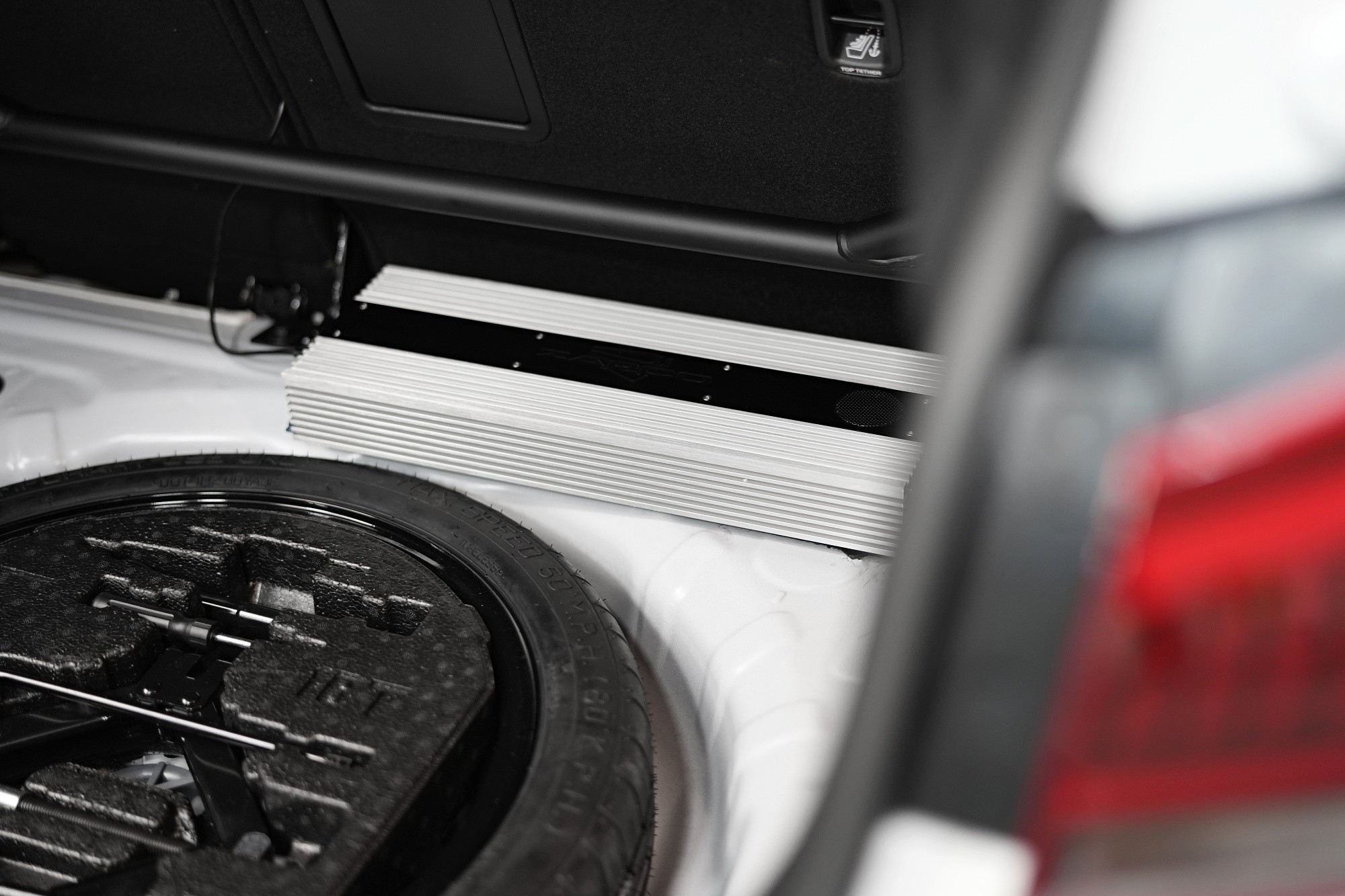 Sound quality zesilovač Zapco ST-6X DSP III s šesti kanály a DSP procesorem jsme umístili do dvojitého dna zavazadlového prostoru, kde se i přes jeho velké rozměry bez problému vměstná. Výkon 100 W RMS na kanál umožní dostatečné watty nejen pro komponentní reproduktory zapojené v aktivním režimu, ale i subwoofer umístěný v zavazadlovém prostoru.