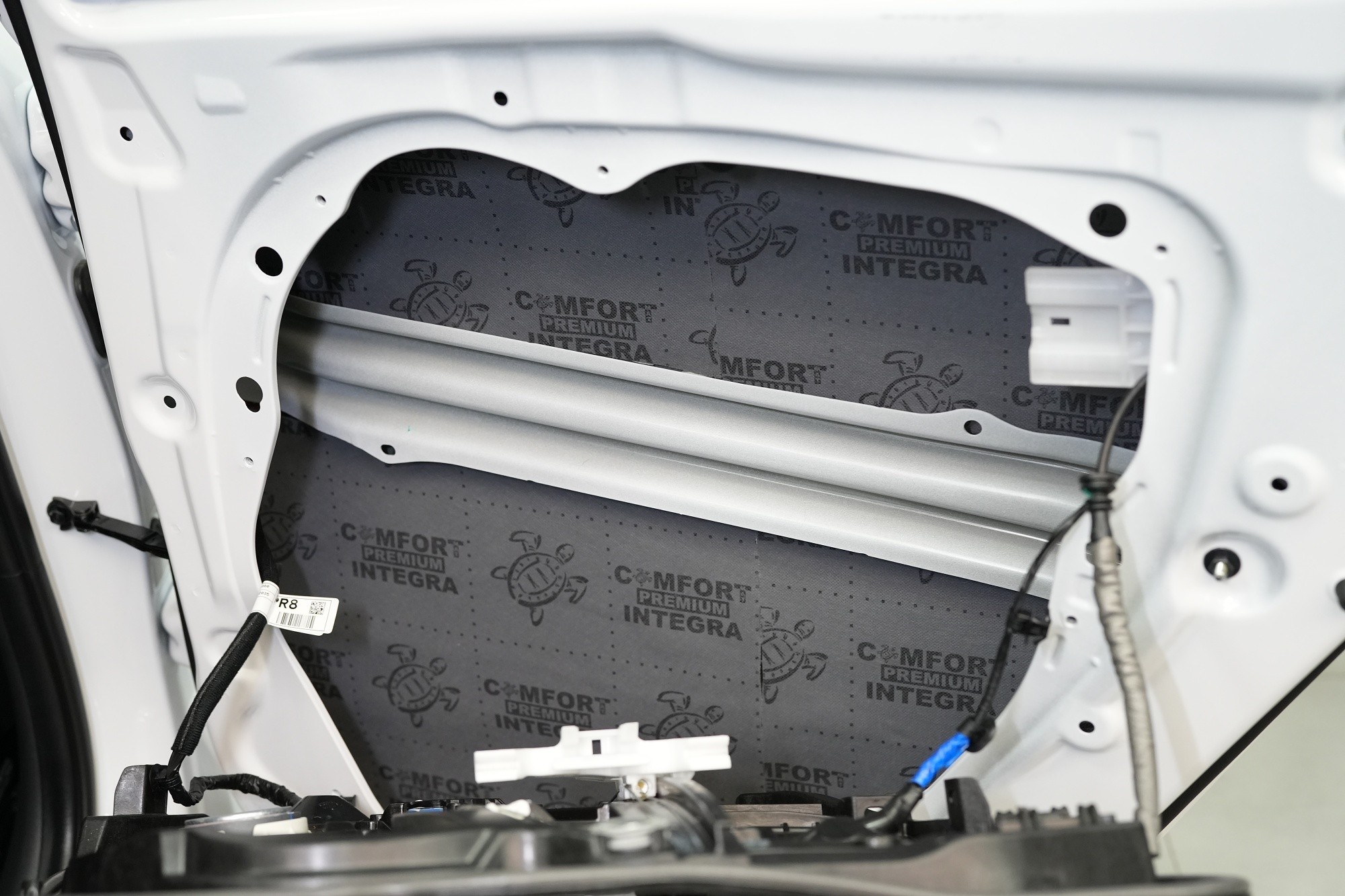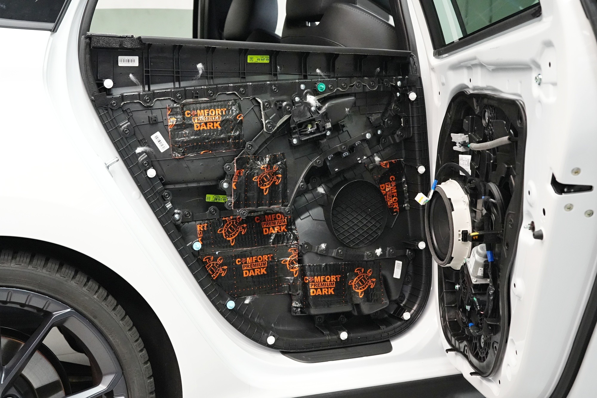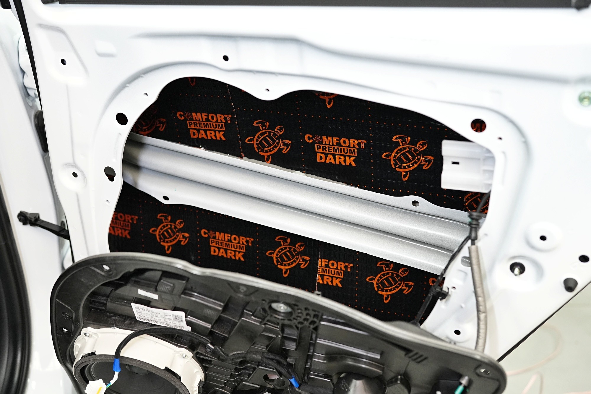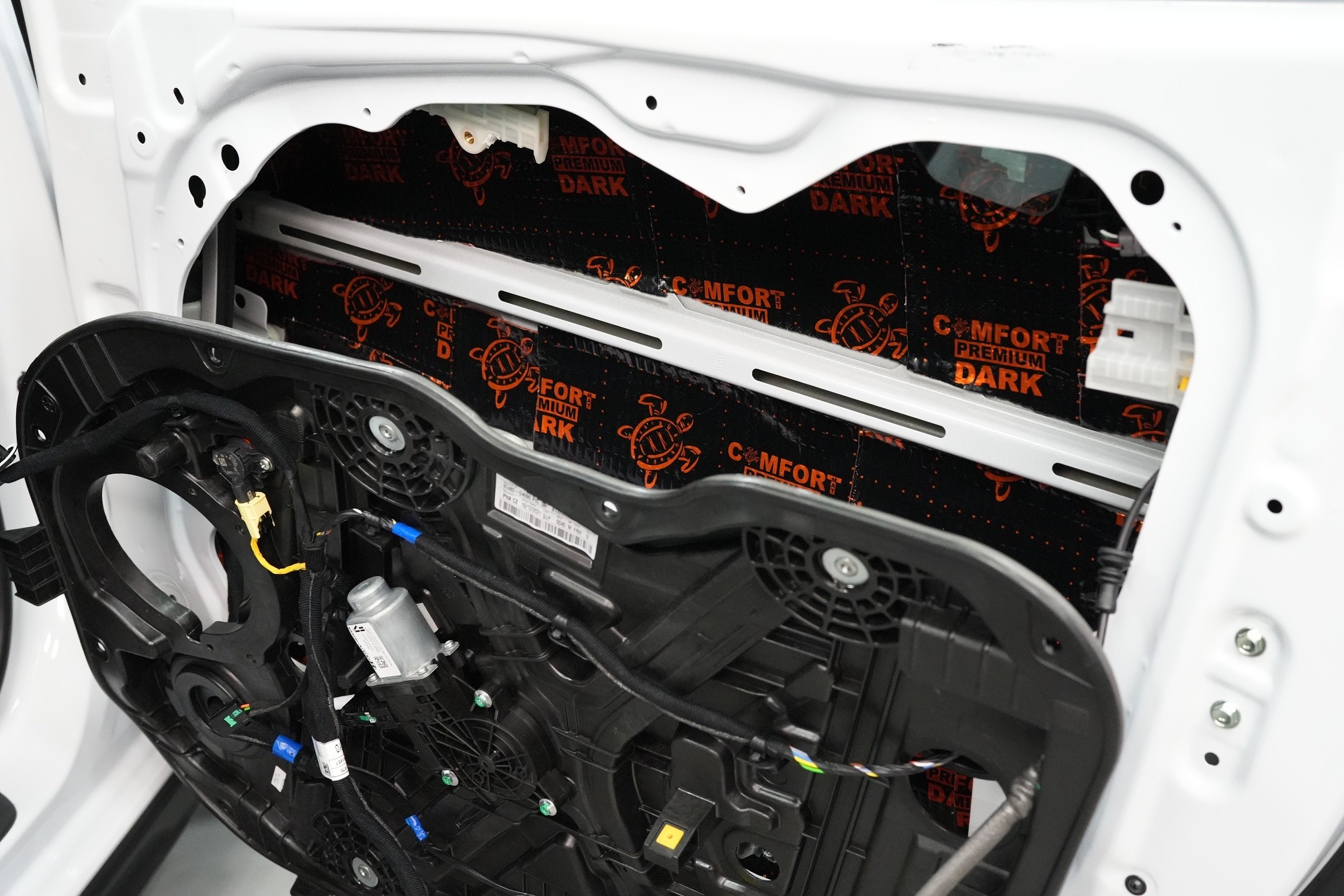 Čtvrtou vrstvou odhlučnění dveří je opět odlehčený antivibrační materiál Comfortmat D2, který aplikujeme bodově i na plastové výplně dveří. Tím plast zejména zpevníme a snížíme různé vibrace a zvuky, které by mohly v budoucnu znepříjemnit jízdu například při poslouchání hudby.
