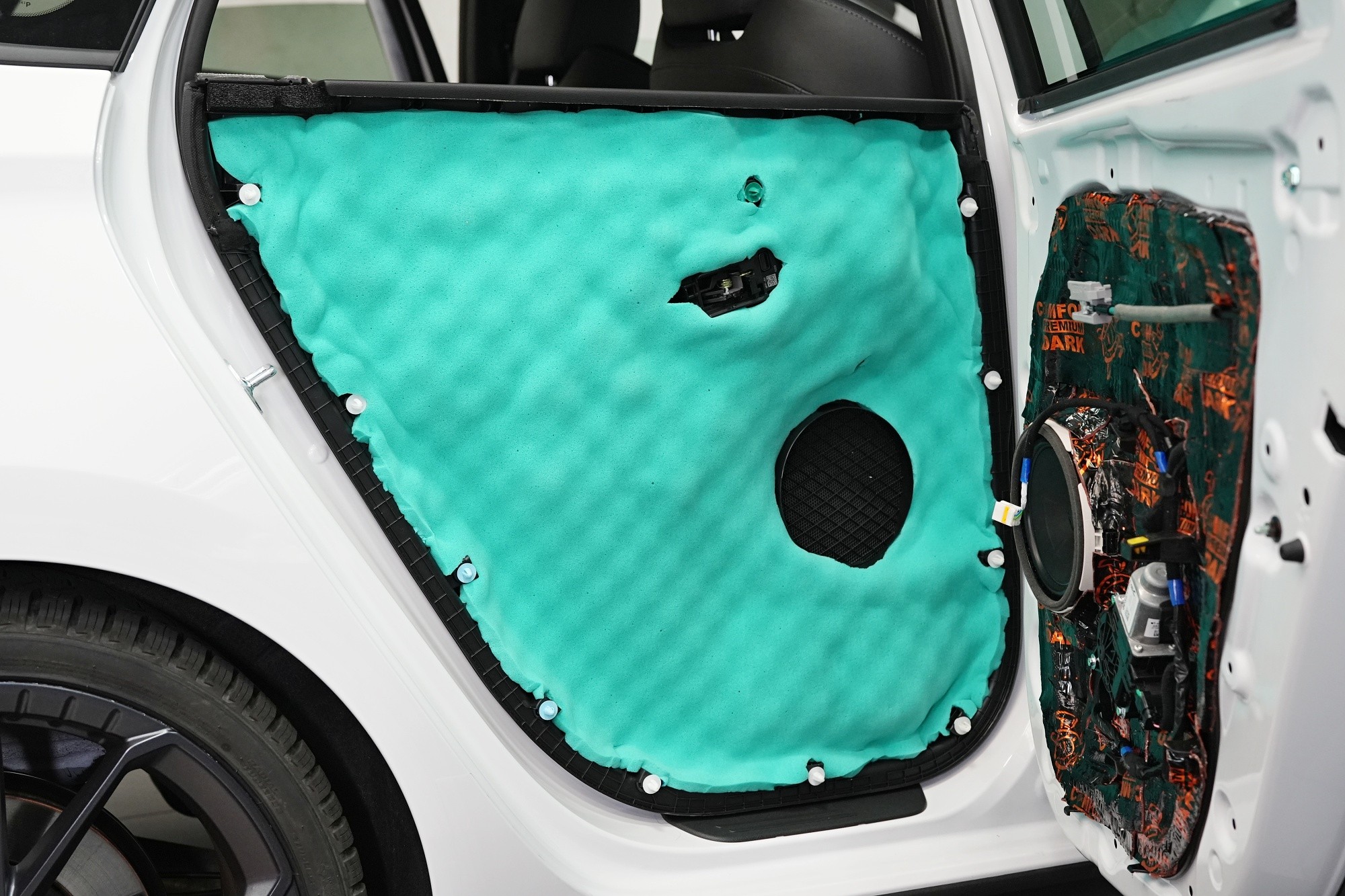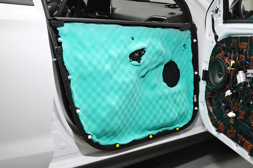 A konečně poslední vrstvou je Comfortmat Softwave o tloušťce 15 mm. Tato flexibilní pěna s tvarovou pamětí se lepí na plastové čalounění dveří z důvodu zamezení skřípání a vrzání nejen plastů, ale i drátů a dalších komponent uvnitř dveří a dodatečně i sníží hluk této oblasti. Stejný postup volíme i u zadních dveří.