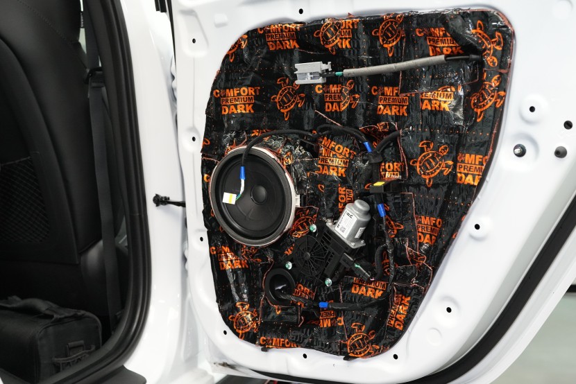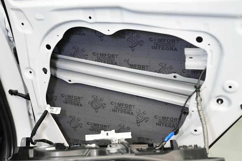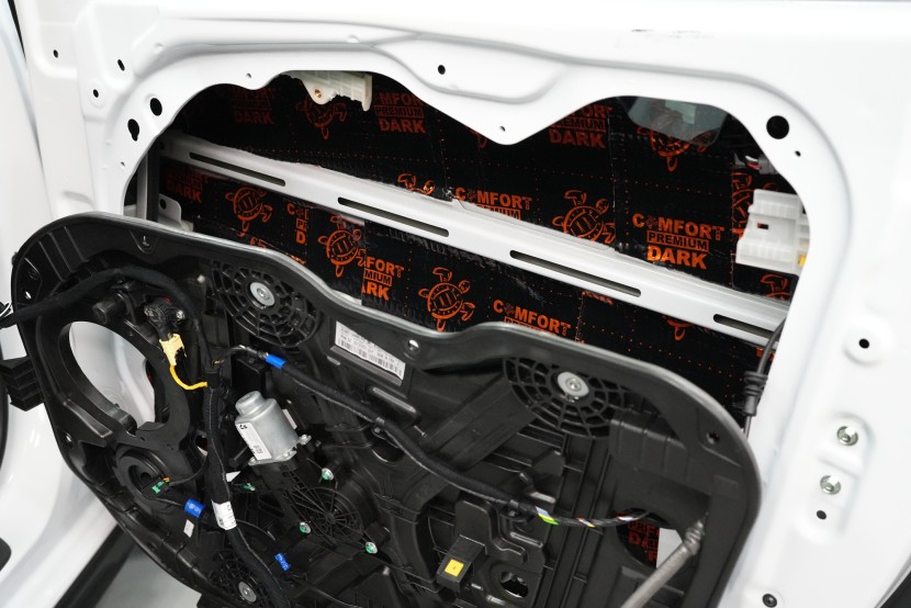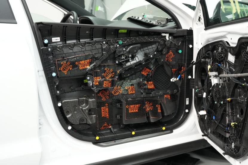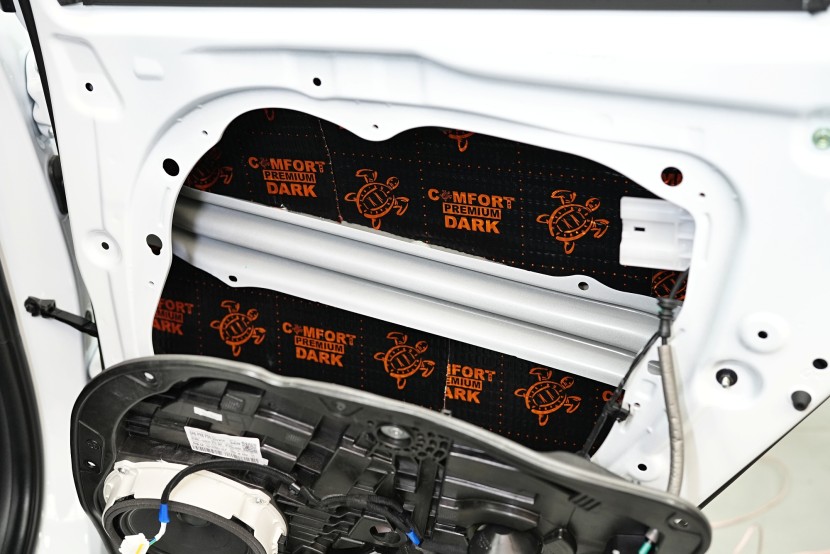 Pokračujeme odhlučněním dveří. Nejprve aplikujeme antivibrační materiál na vnější plech dveří, konkrétně Comfortmat Dark D2 o tloušťce 2,3 mm. Ten s přehledem zlikviduje vibrace, zamezí pronikání nízkofrekvenčního hluku a zpevní velmi tenký plech dveří. Materiál disponuje velmi nízkou hmotností, je samozřejmě voděodolný a má mimo jiné antikorozní vlastnosti.