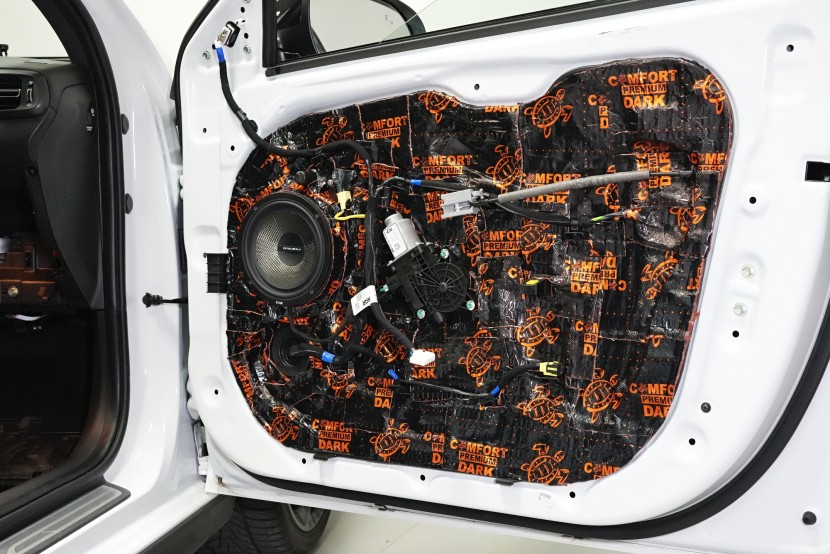 Třetí vrstvou je taktéž odlehčený antivibrační materiál Comfortmat D2. Tato vrstva slouží k zamezení vibrací a rezonancí vnitřního plechu dveří a k vytvoření uzavřené ozvučnice pro reproduktory. Díky tomu dojde zejména ke zvýraznění basové složky nových reproduktorů. Stejný postup samozřejmě volíme i u zadních reproduktorů.
