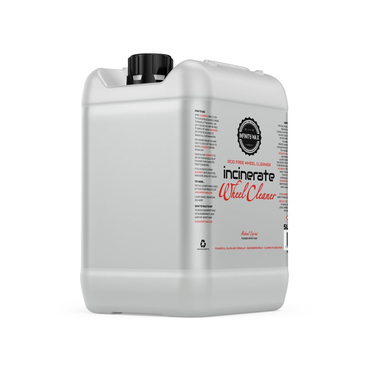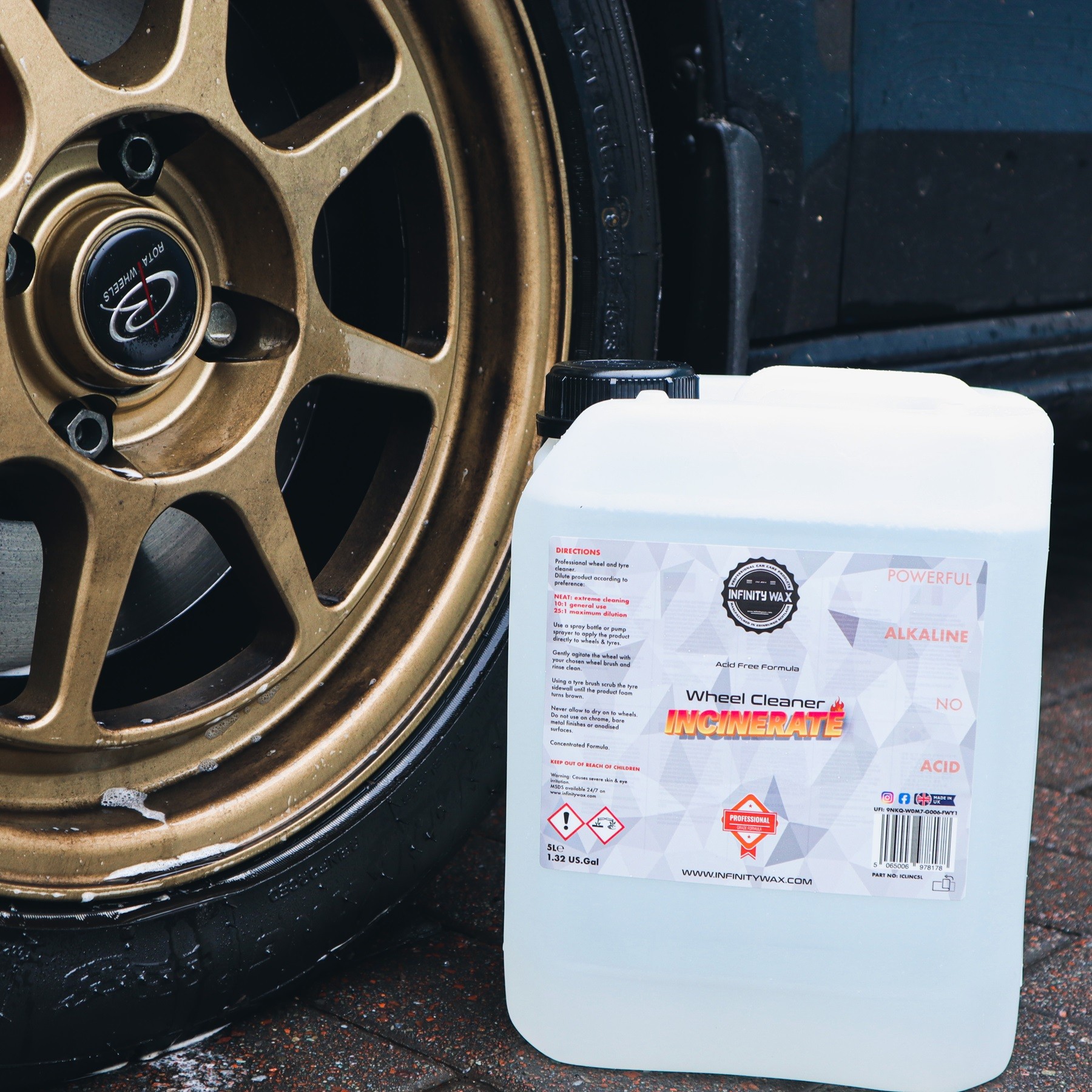 Incinerate je vysoce koncentrovaný alkalický čistič kol, který byl navržen pro bezdotykové čištění kol nebo hloubkové čištění kol i pneumatik, a to úplně bez námahy. Je zcela bez obsahu jakýchkoli kyselin a používá jedinečnou směs účinných detergentů, které byly spojeny do lehkého rozpouštědla. To přesně znamená, že rozpouštědlo, které ve výrobě použili, je na molekulární úrovni lehčí než voda, a to umožňuje produktu proniknout silným brzdovým prachem a špínou rychleji než jakýkoli jiný čistič kol, se kterým jste se doposud setkali. Klíčovými vlastnostmi produktu je jeho siilný výkon a poměr ředění. Můžete se spolehnout na to, že jeho velmi vysoké ředicí poměry ulehčí práci i těm nejhorším kolům, jaké si lze představit. Navíc ředicí poměry až 1:25 činí Incinerate mimořádně dobrou hodnotou v poměru cena/výkon. Ideálně se používá před předmytím auta a také před použitím jakéhokoli odstraňovače nečistot. Kromě toho je výjimečným čističem pneumatik a má schopnost emulgovat silikonové ochrany pneumatik a "vytahovat" je z gumy, což vám umožňuje jednoduše je opláchnout. Pokud jde o robustní a spolehlivý čistič kol, který vás nezruinuje, je těžké myslet na "životaschopnější" variantu.Hlavní vlastnosti