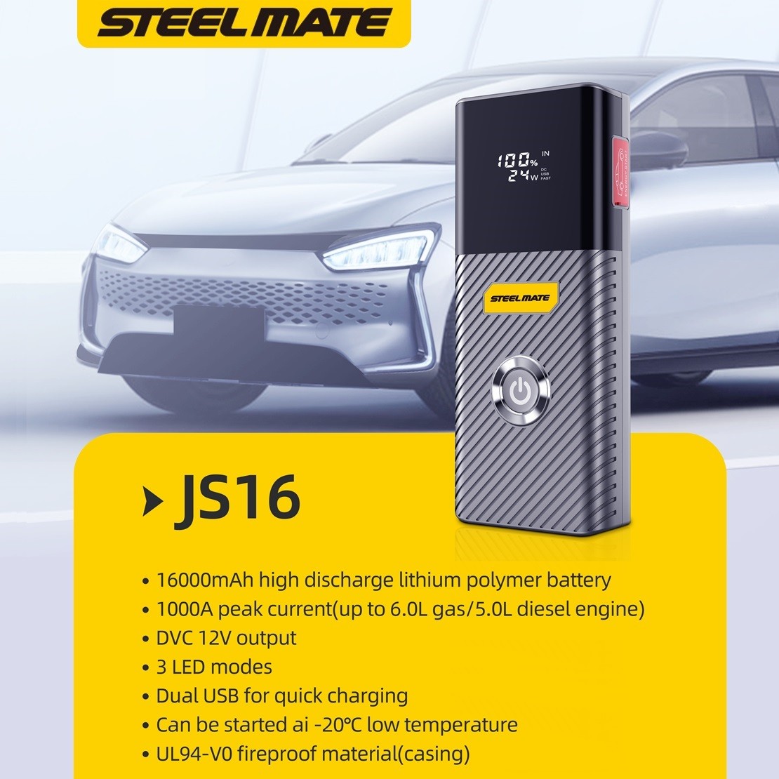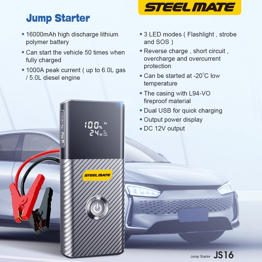 Startovací sada s kapacitou 16.000 mAh od Steelmate pomůže nastartovat vozidlo a navíc slouží jako powerbanka pro USB nabíjení, nebo jako přenosné LED světlo. Jump starter disponuje přehledným LCD displejem, který zobrazuje aktuální provozní stav.