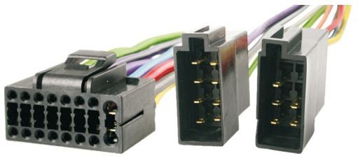 Kabelové svazky pro autorádia JVC se specifickým konektorem na straně autorádia a ISO konektorem na straně automobilu. Délka vodičů bývá obvykle 12-13 cm. Kabely jsou navíc barevně označené a s popisem.