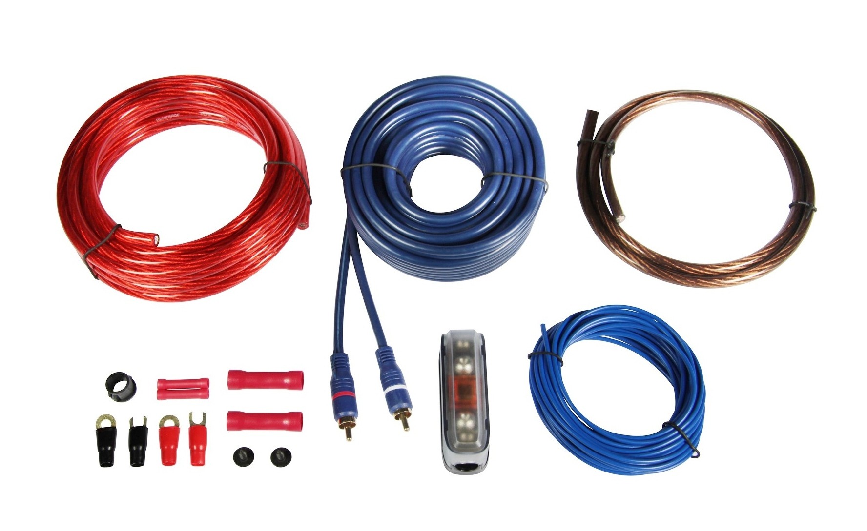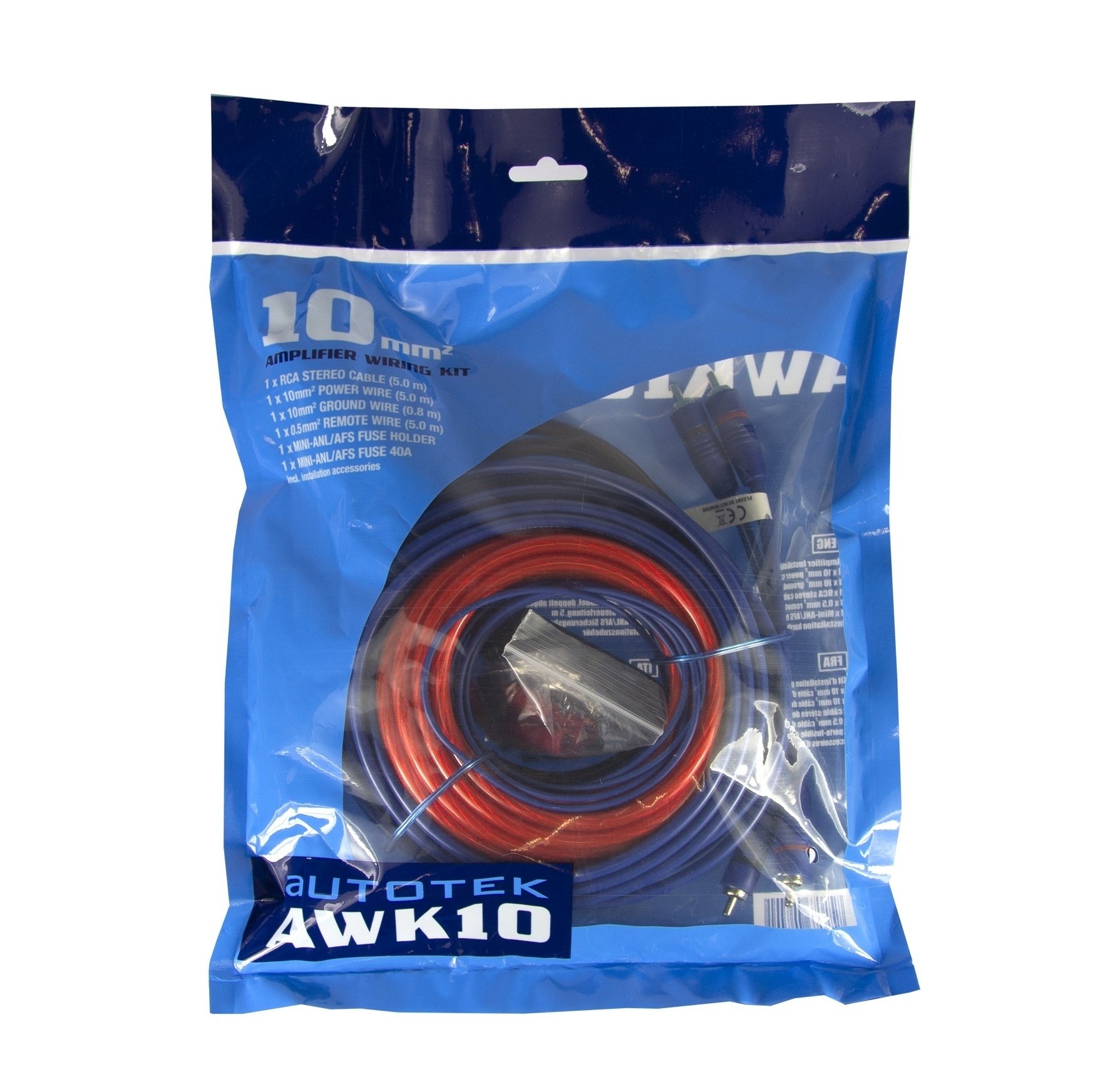 Autotek AWK10 je kompletní kabelová sada určená pro instalaci zesilovače v základních až středně výkonných car audio systémech. Je navržena tak, aby pokryla klíčové části instalace bez nutnosti dokupování dalších komponentů. Součástí sady je napájecí a zemnicí kabel řezu 10 mm², dále dvojitě stíněný stereo RCA kabel a ovládací kabel pro spínání zesilovače. Napájecí část je doplněna držákem pojistky typu AFS (Mini-ANL) včetně pojistky, což zajišťuje základní ochranu instalace.