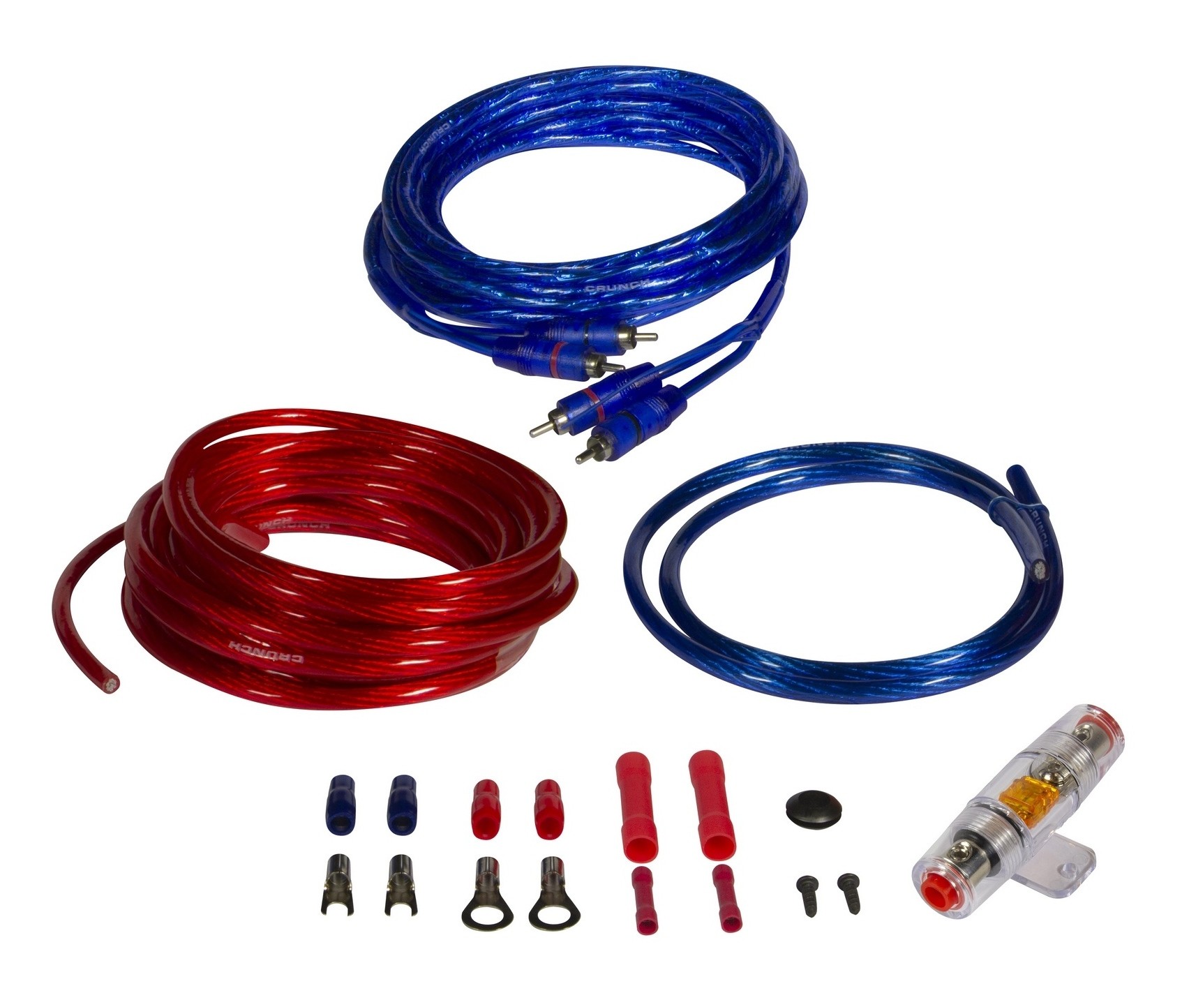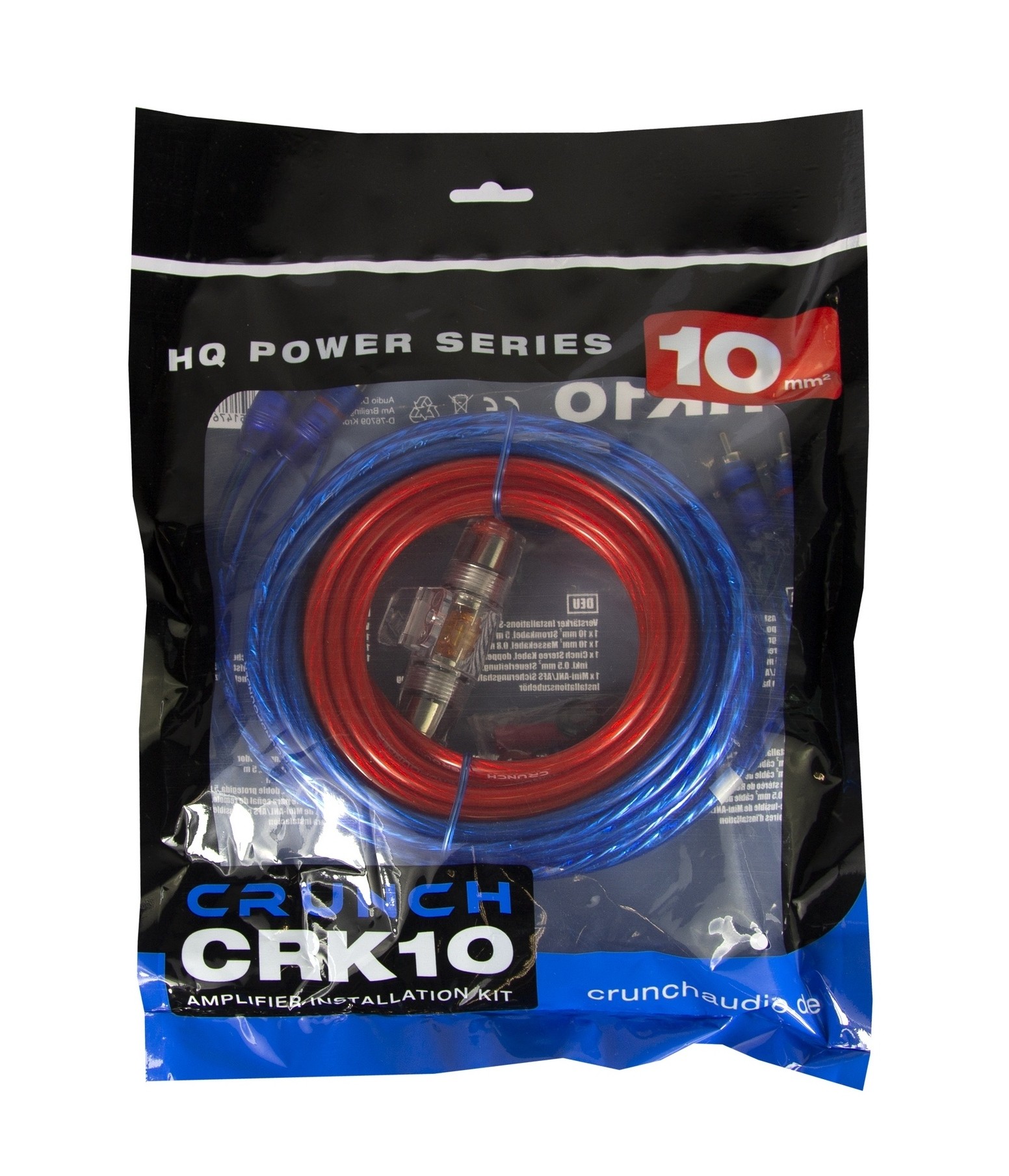 Crunch CRK10 je instalační kabelová sada určená pro zapojení zesilovače v základních a středně výkonných audio sestavách. Obsahuje všechny podstatné prvky potřebné k realizaci napájení i signálového propojení bez nutnosti dokupování dalších částí. Součástí balení je napájecí a zemnicí vodič o průřezu 10 mm², stíněný stereo RCA kabel pro přenos signálu a samostatný remote vodič pro spínání zesilovače. Napájecí větev je vybavena držákem pojistky typu AFS (Mini-ANL) včetně 40 A pojistky pro základní jištění instalace.
