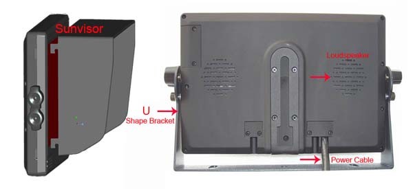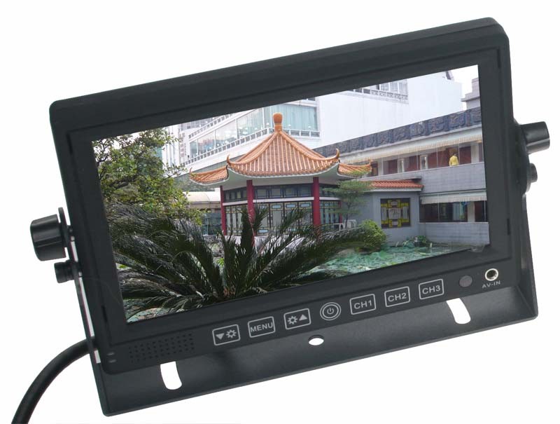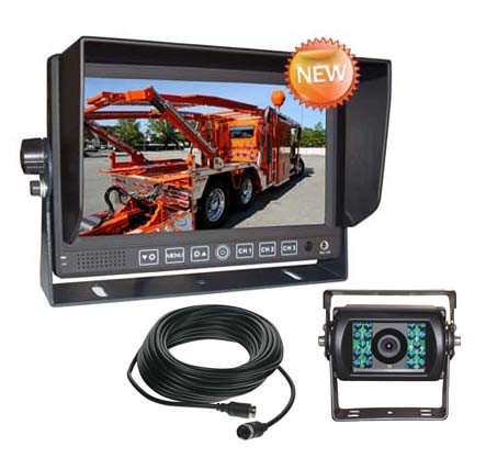 LCD monitor 7" s protisluneční clonou, širokým úhlem pohledu a displejem s vysokým rozlišením. Kamera CCD s IR světlem vnější je určená pro montáž především na nákladní vozy, autobusy, karavany či dodávky. Propojení 4pinovým kabelem.