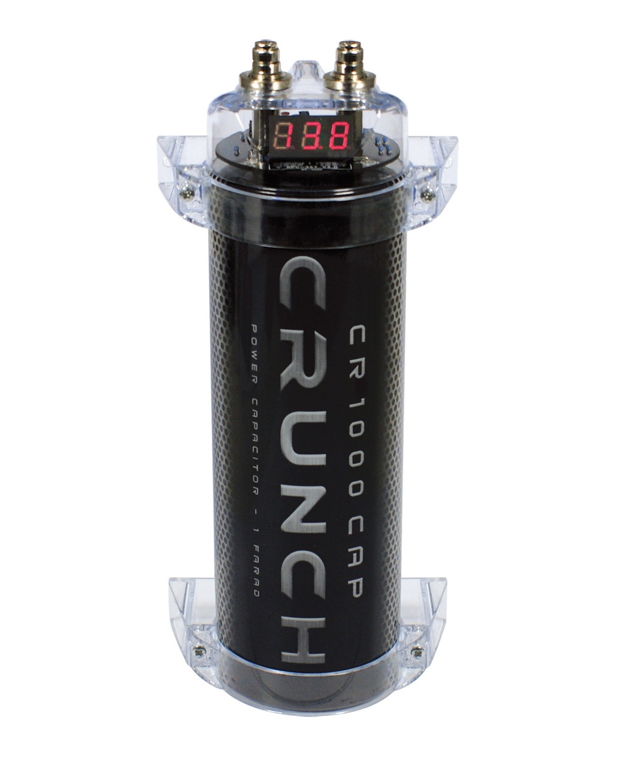 Crunch CR1000CAP je 1,2 F kapacitor určený pro stabilizaci napájení zesilovačů v car audio systémech. Jeho úkolem je vyrovnávat krátkodobé poklesy napětí při dynamických špičkách, typicky při výrazných basových pasážích, a tím pomoci zesilovači udržet stabilnější provoz. Kapacitor je osazen třímístným digitálním voltmetrem, který umožňuje okamžitou kontrolu napětí v systému a funkcí automatického zapnutí, díky níž se aktivuje společně s audio systémem bez nutnosti dalšího ovládání. Stabilní akrylové držáky zajišťují pevnou a bezpečnou instalaci a zároveň podtrhují výraznější vizuální provedení celého zařízení.