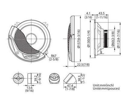| Montážní hloubka středobasového reproduktoruMontážní hloubka reproduktoru se měří od nejspodnější hrany magnetu až po spodní okraj plechového, plastového nebo litého koše reproduktoru, resp. dosedací plochy reproduktoru. | 43,5 mm |