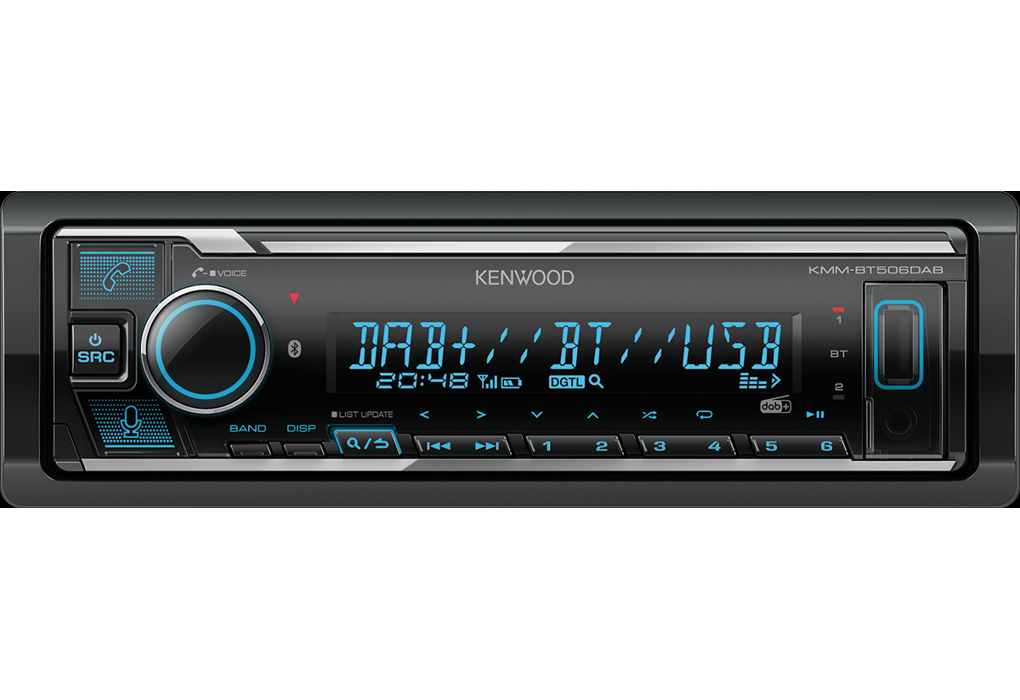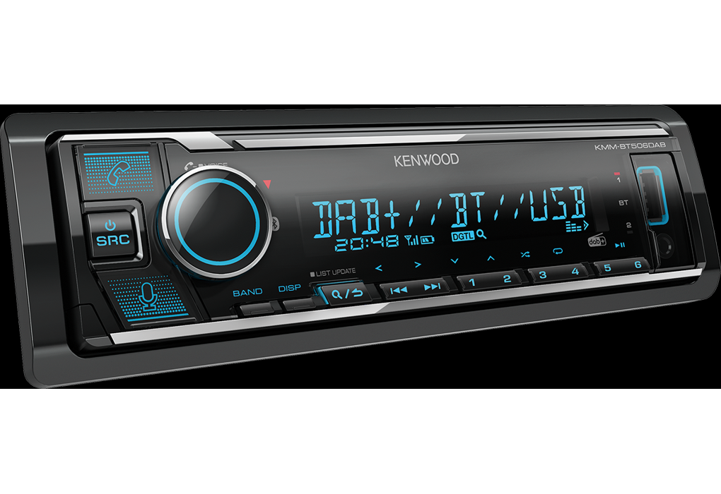 Bezmechanikové autorádio značky Kenwood KMM-BT506DAB s USB a s vestavěným DAB+, Bluetooth a přípravou pro Spotify a Amazon Alexa. Díky absenci CD mechaniky je autorádio kratší a jeho montáž o dost jednodušší.