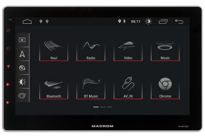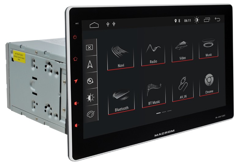 Multimediální přehrávač s 10,1" kapacitním displejem, 2DIN tělo přístroje, operační systém Android Oreo 8.1. Macrom M-AN1000 je multimediální jednotka s operačním systémem Android. 2DIN velikost a 10,1" kapacitní displej ve formě tabletu umožňuje instalaci do řady automobilů, kam doposud nebylo možné instalovat jednotku s touto velikostí monitoru. Přístroj je vybaven zesilovačem 4 x 45 W, AM/FM tunerem, Bluetooth handsfree sadou s podporou streamování hudby, třemi zadními USB konektory, mikro SD kartou, vstupem pro zadní a přední parkovací kameru, integrovaným GPS přijímačem, Wifi. Operační systém Android Oreo 8.1 umožňuje používat přístroj stejně, jako byste používali smartphone nebo tablet. Můžete číst e-maily, vyhledávat informace na internetu, přehrávat hudbu nebo videa na YouTube, instalovat oblíbené aplikace a mnoho dalších funkcí.