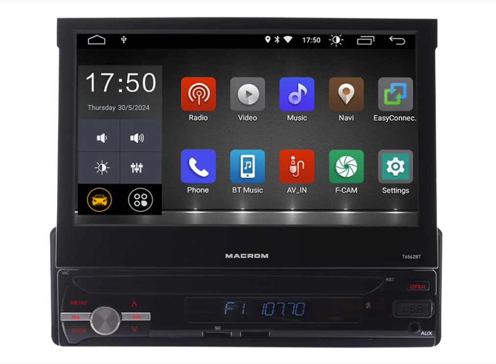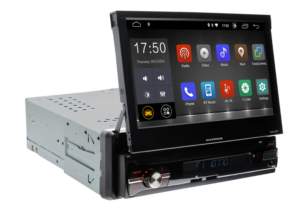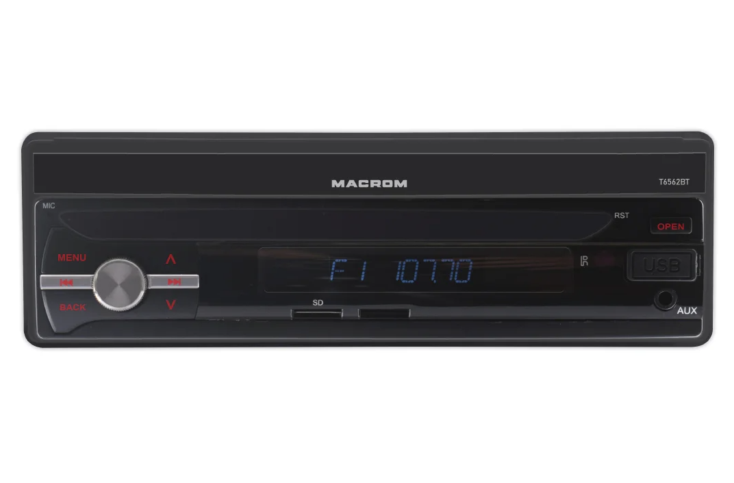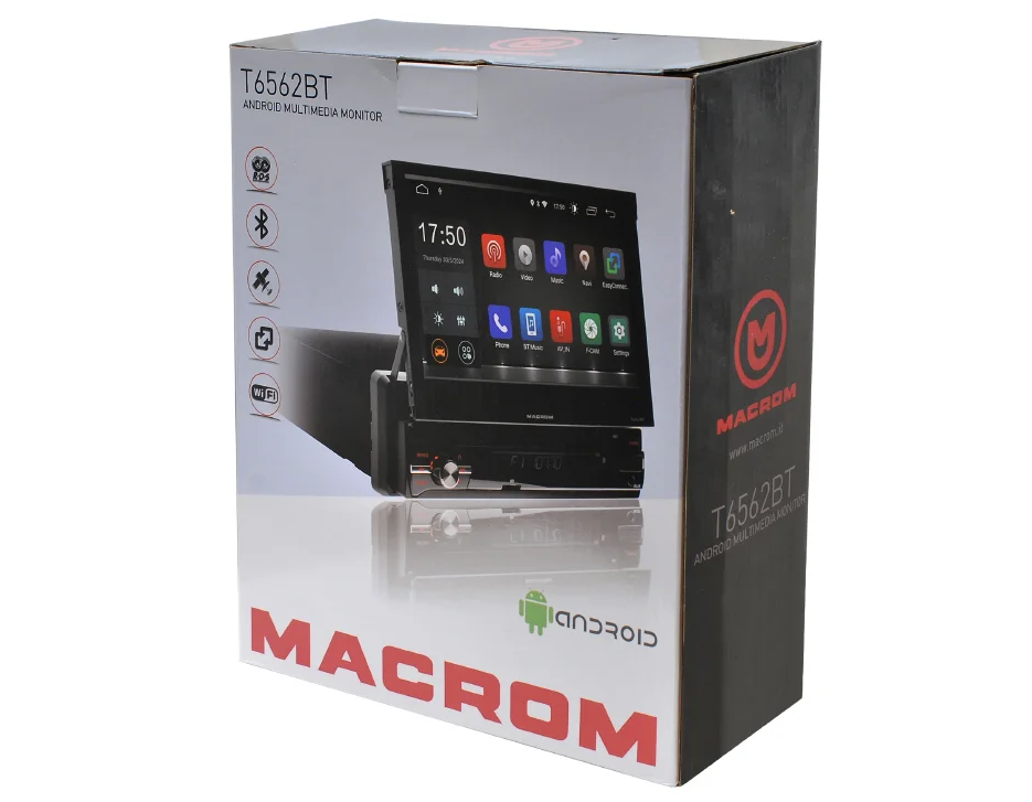 MACROM M-T6562BT je univerzální multimediální jednotka s operačním systémem Android 10 a 7″ kapacitním dotykovým displejem, který se motoricky vysouvá z těla přístroje velikosti 1DIN. Díky tomu lze tuto moderní jednotku nainstalovat i do vozidel, kde není prostor pro klasické 2DIN autorádio. Nabízí výkon 4 × 45 W, Bluetooth handsfree s importem telefonního seznamu a podporou hudebního streamování, vestavěný GPS přijímač, Wi-Fi a široké možnosti připojení externích zařízení. Umožňuje online navigaci, instalaci aplikací, sledování videí či poslech hudby přes internet stejně jako na chytrém telefonu či tabletu.