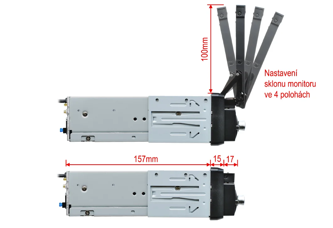 - Displej: 7″ kapacitní, dotykový, poměr stran 16:9, motorově vysouvací.