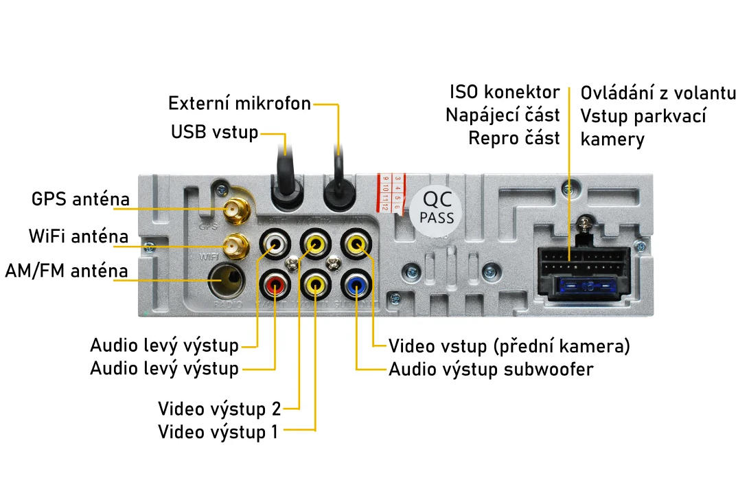 - Vstupy: AV (CINCH), vstupy pro přední i zadní kameru.