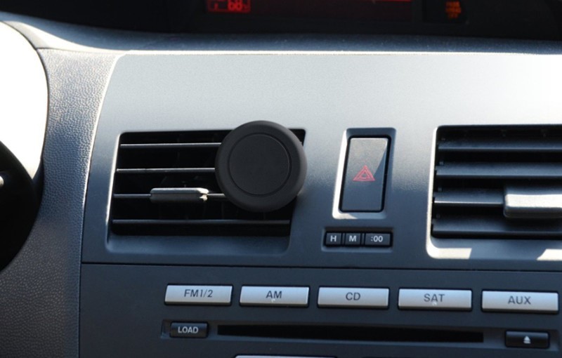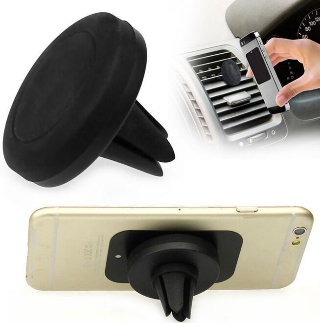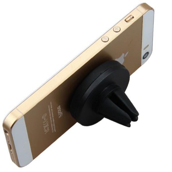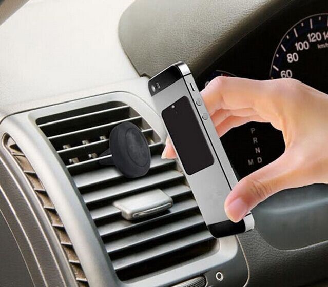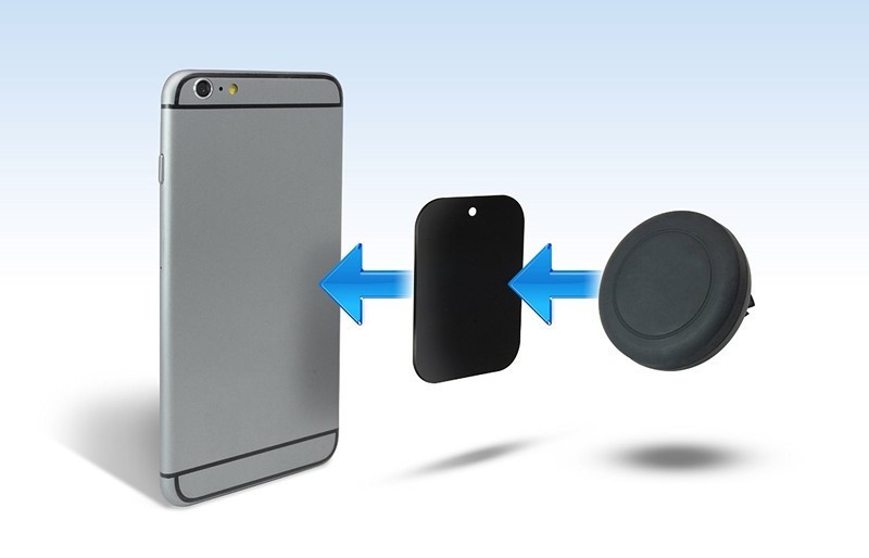 Univerzální držák pro smartphony, černé barvy, s magnetickou plochou, určený pro umístění na mřížku výduchu ventilace. Upevnění pouhým položením telefonu na magnetickou plochu. Na mobilní telefon se upevní kovová plotýnka, při přiblížení telefonu s touto destičkou (k držáku), je telefon velkou silou přitažen na dotykovou plochu držáku.