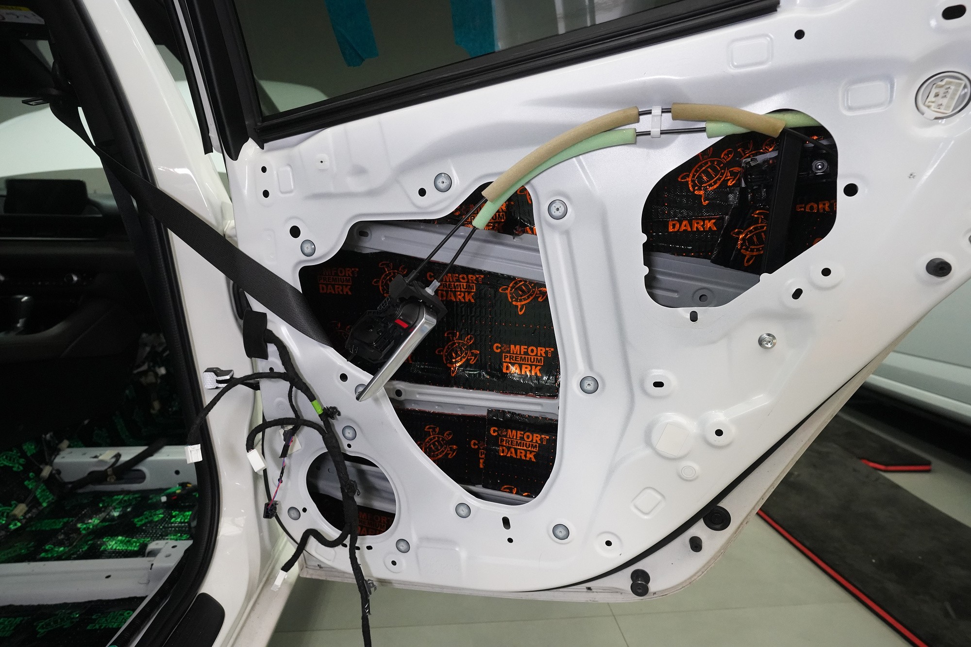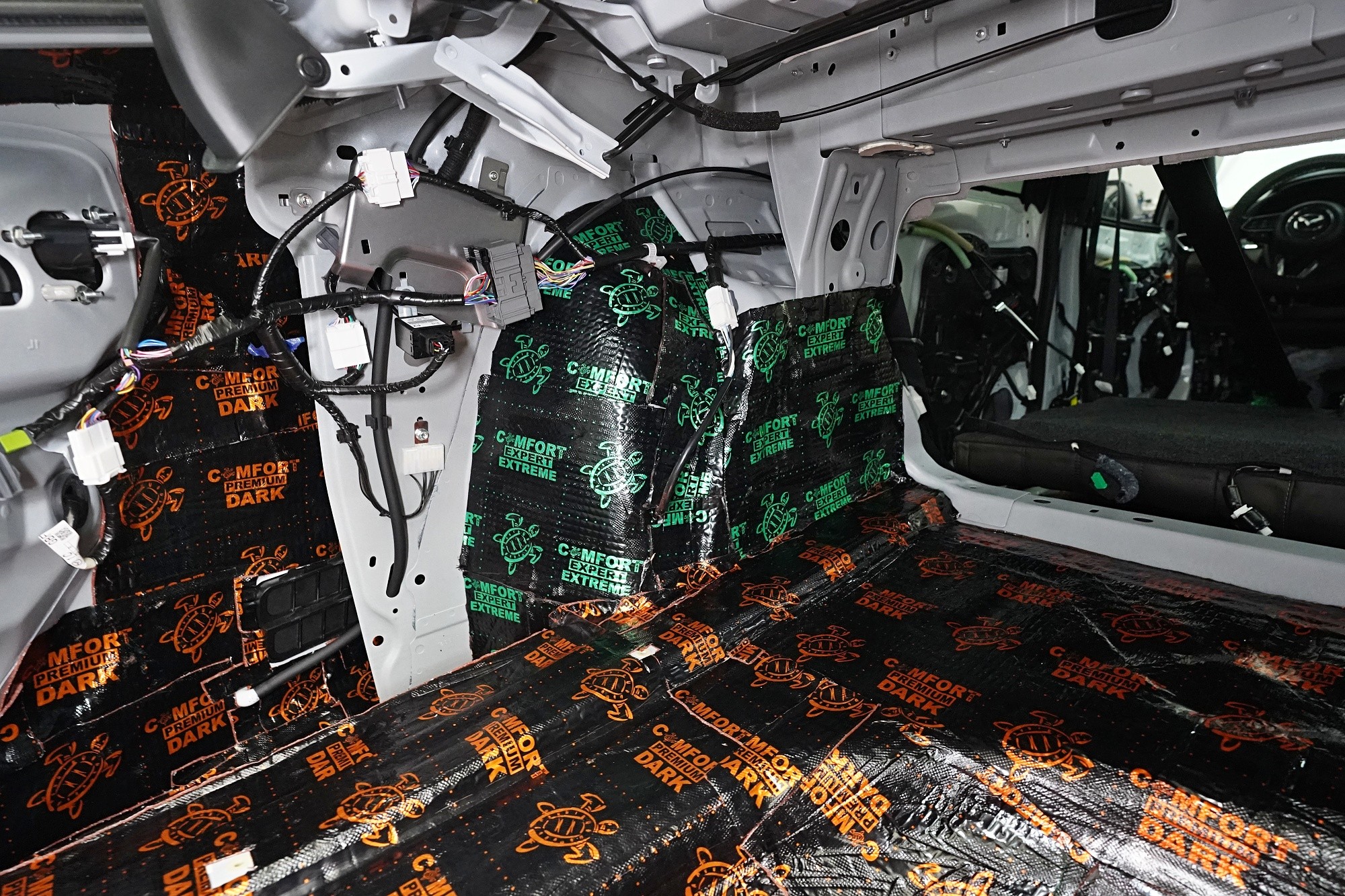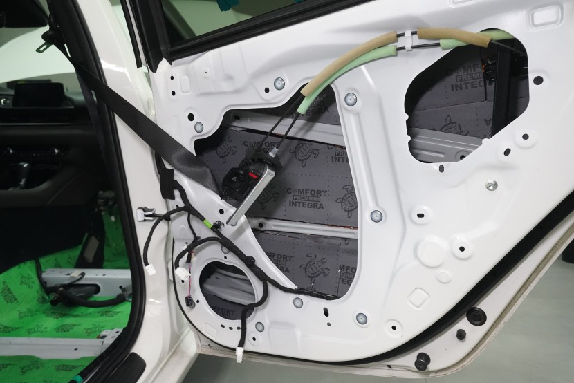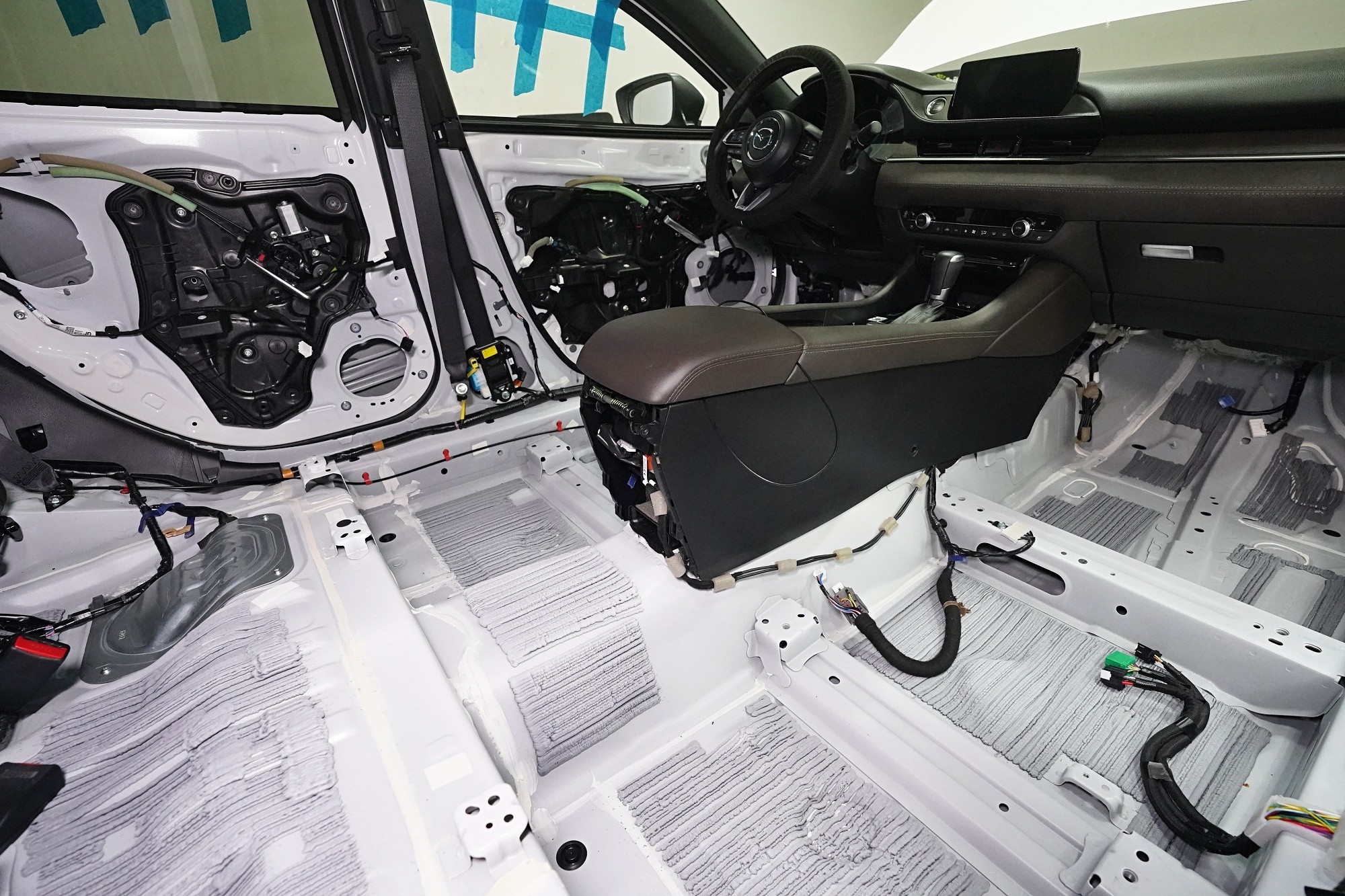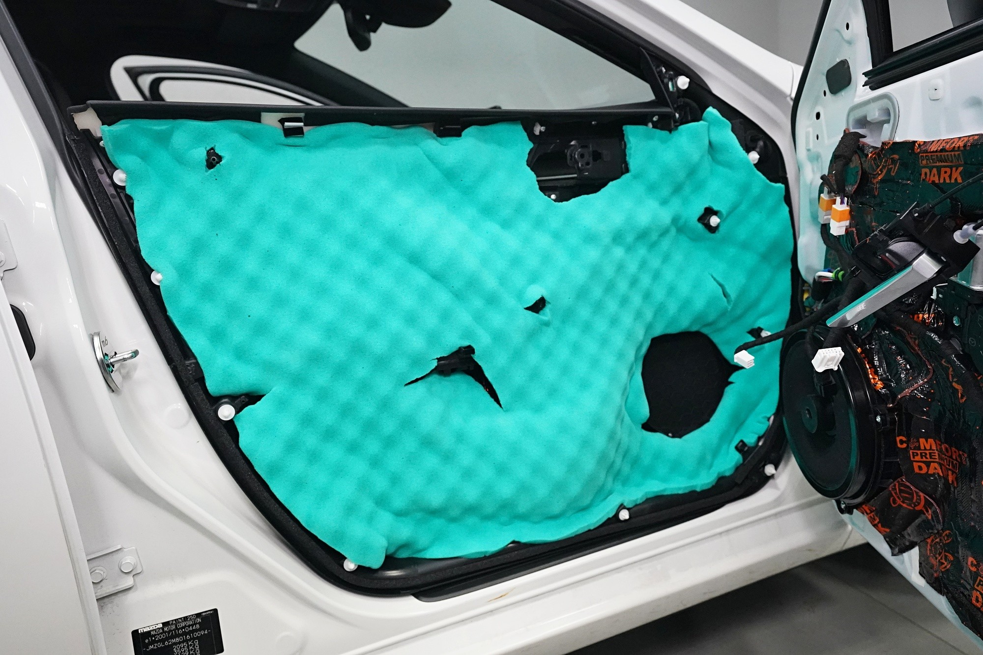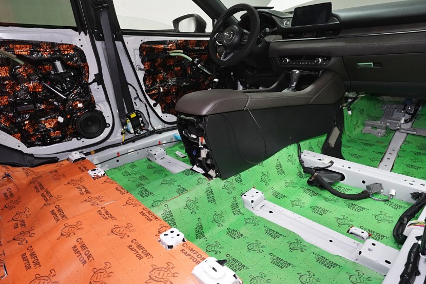 Odhlučnění vozu Mazda 6 a tedy již tradiční návštěvník naší dílny. Instalace byla tentokrát v rozsahu odhlučnění, který jsme tu ještě neměli, konkrétně v rámci balíčku Premium Plus. Mazda 6 bohužel patří k nejhlučnějším vozům ve své třídě a hluk motoru, hučení pneumatik, ale i aerodynamický hluk se stoupající rychlostí rychle zkazí dojem z tohoto prémiového japonského vozu. Zaměřili jsme se na všechny zásadní oblasti vozu kromě střechy, konkrétně tedy na přední, zadní a páté dveře, podlahu, zavazadlový prostor, přední i zadní podběhy z vnitřní strany a kapotu. U balíčku Premium Plus se intenzivněji věnujeme zejména podlaze a podběhům, kde aplikujeme špičkové materiály Comfortmat z profesionální řady Expert. Na instalaci pracovali zároveň 3 naši zkušení technici, kteří montáž zvládnou v rámci 1 pracovního dne. Více zajímavých informací o instalaci se dozvíte v naší fotoreportáži.