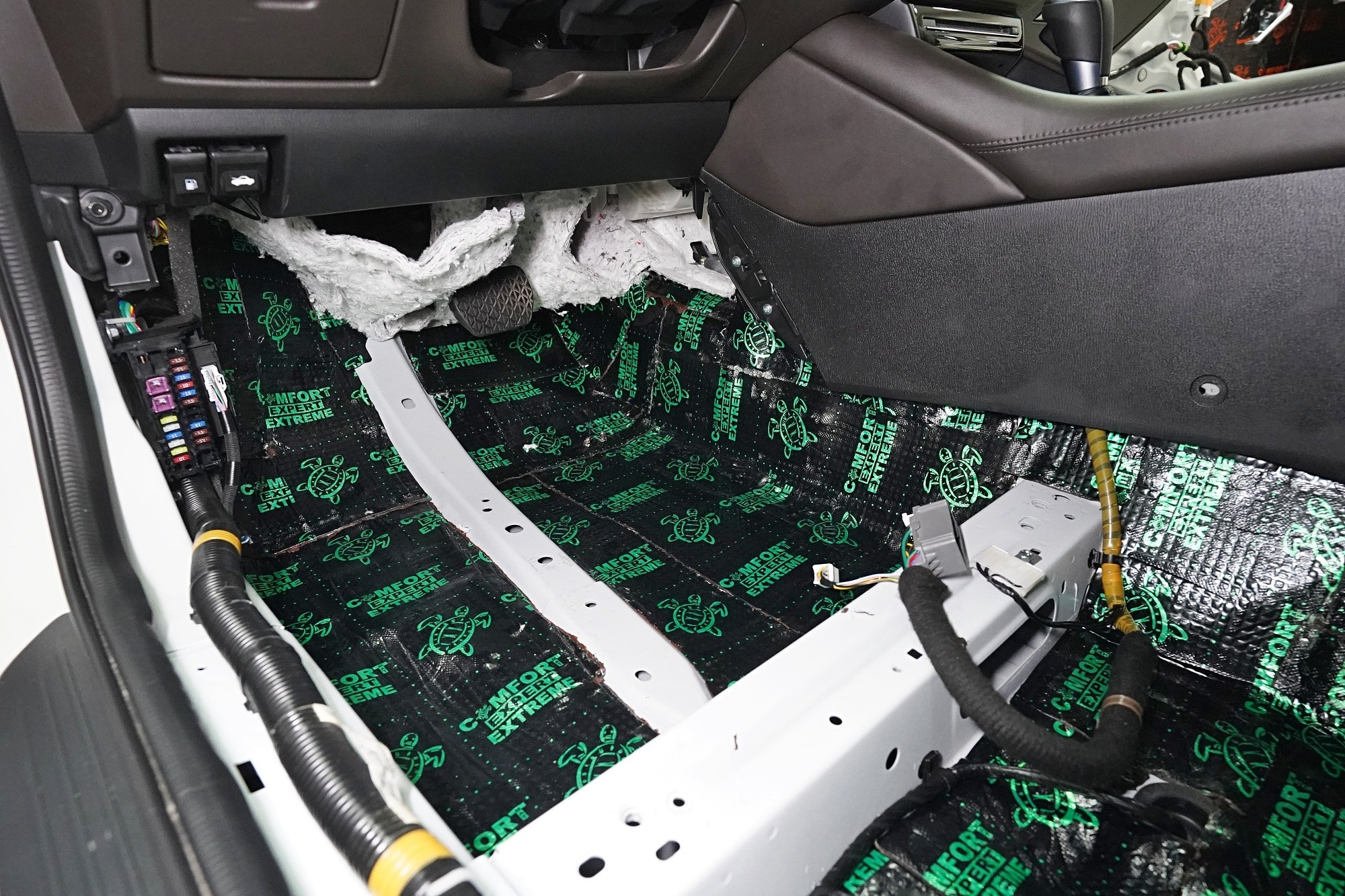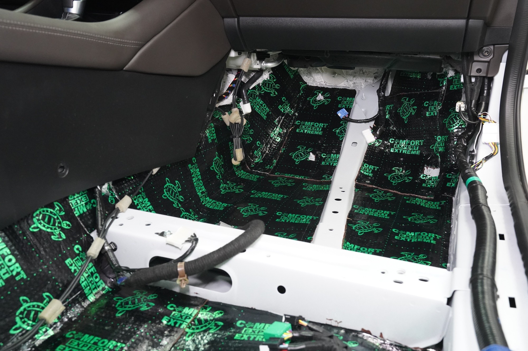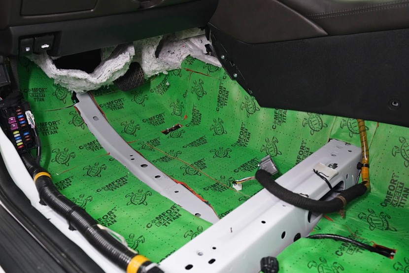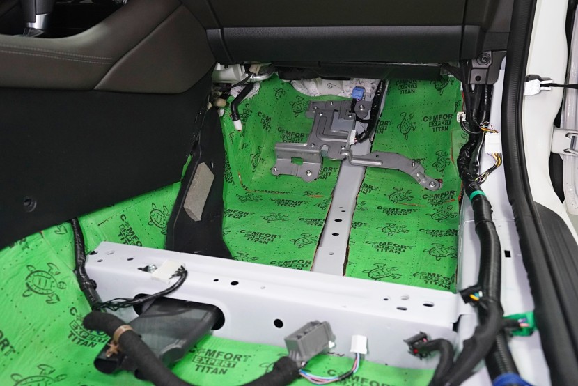 Titan Lite spolu s Extremem aplikujeme na všechny přístupné oblasti, abychom umožnili izolaci maximálního množství vibrací a hluku. V přední části podlahy se dostáváme až pod palubní desku, díky čemuž důkladně odhlučníme i přední podběhy z vnitřní části vozu, kde je přístup k větší ploše karoserie. Podlahu tedy odhlučňujeme vysoce účinným antivibračním materiálem o tloušťce 3,5 mm a zvukově izolačním materiálem v druhé vrstvě o tloušťce 7 mm. Celkem tedy téměř 11 mm špičkové zvukové izolace, což má za následek důkladné zamezení hluku od předních pneumatik i bez aplikace z vnější strany.