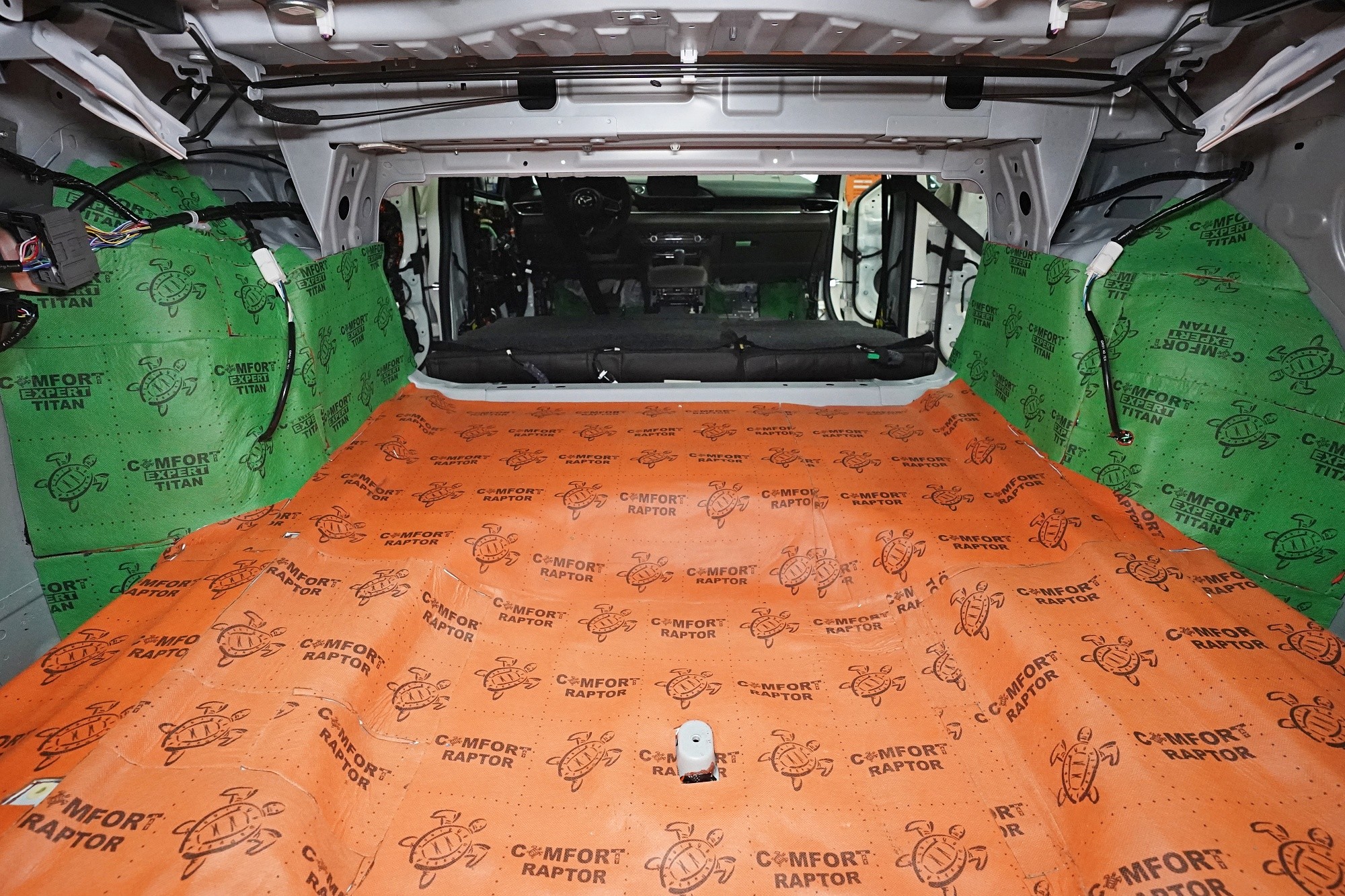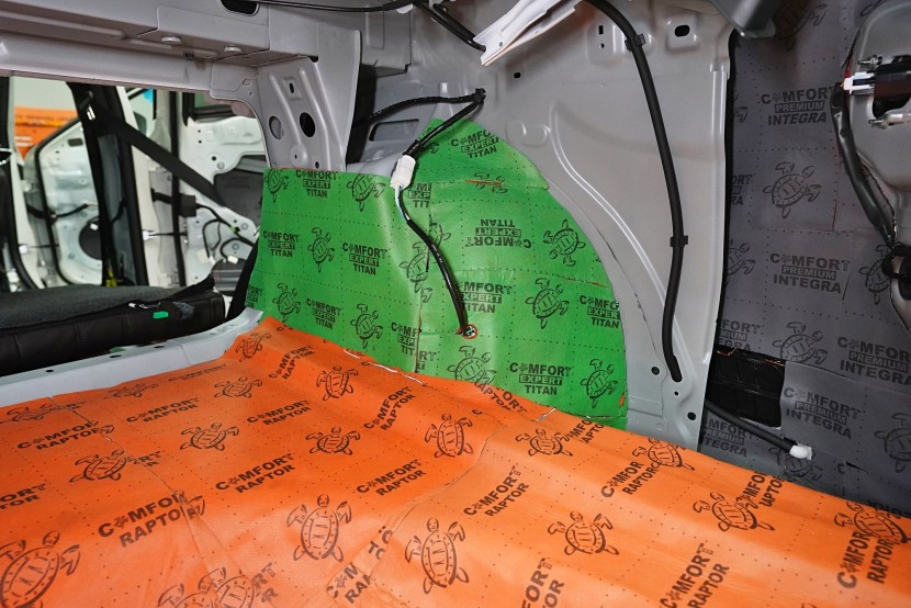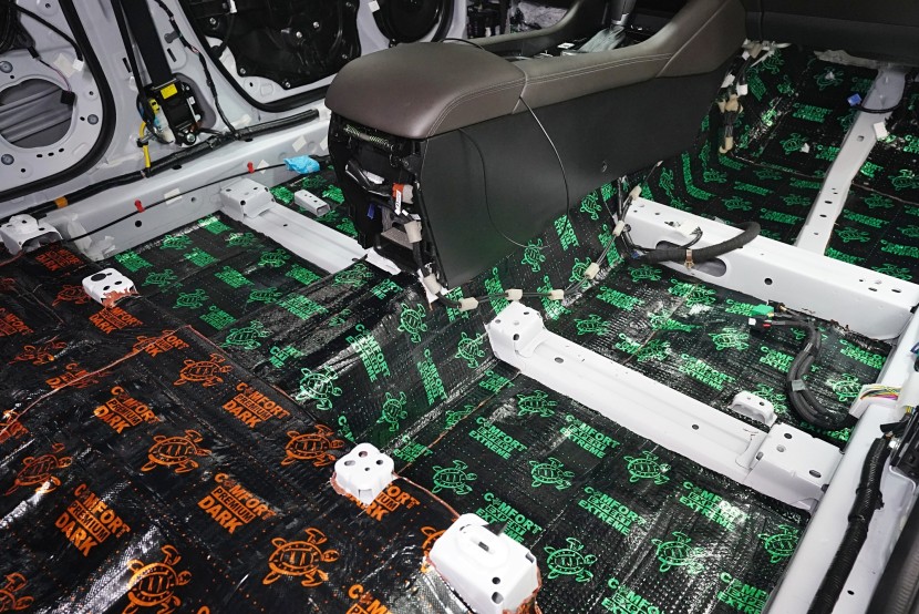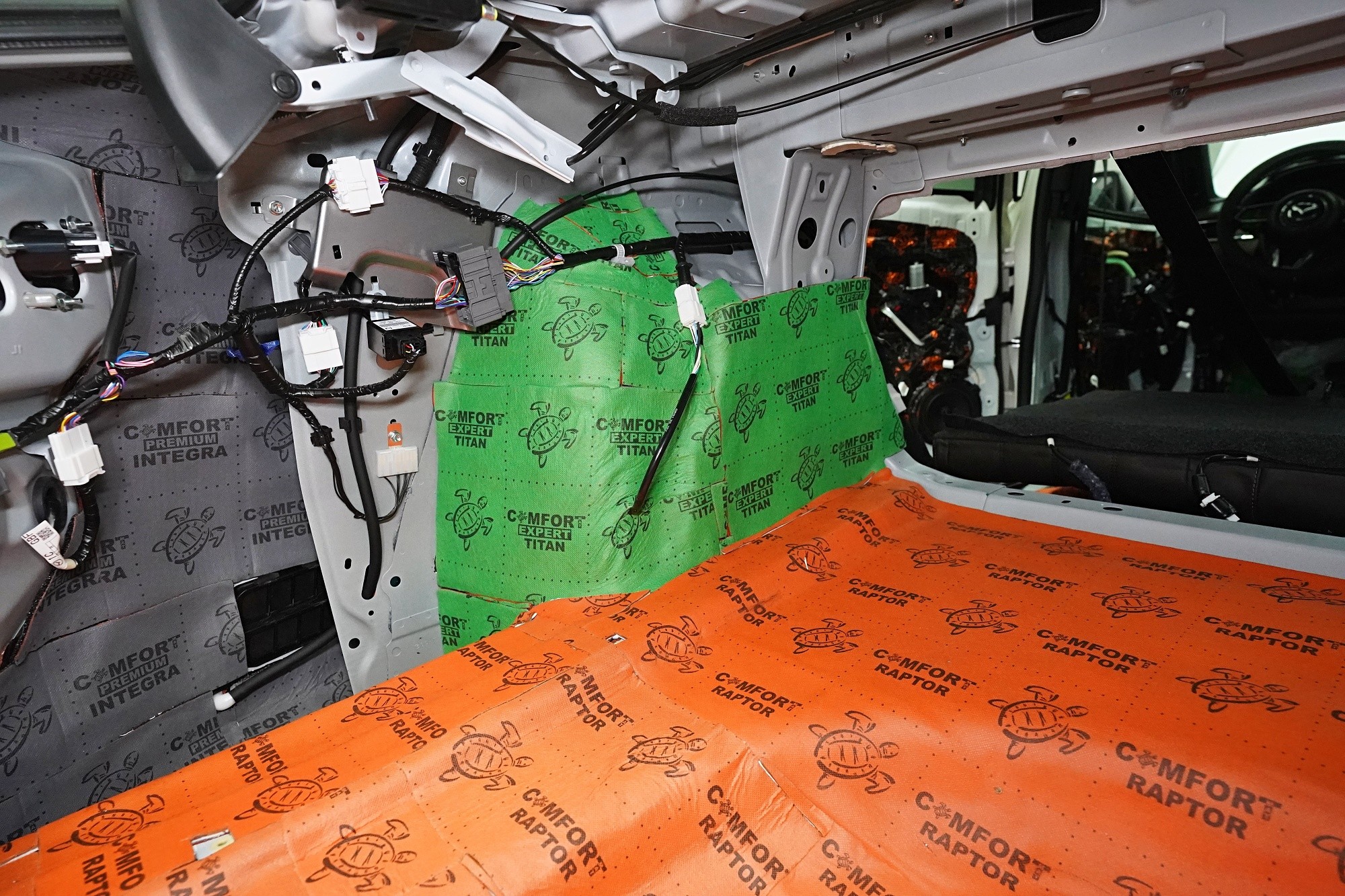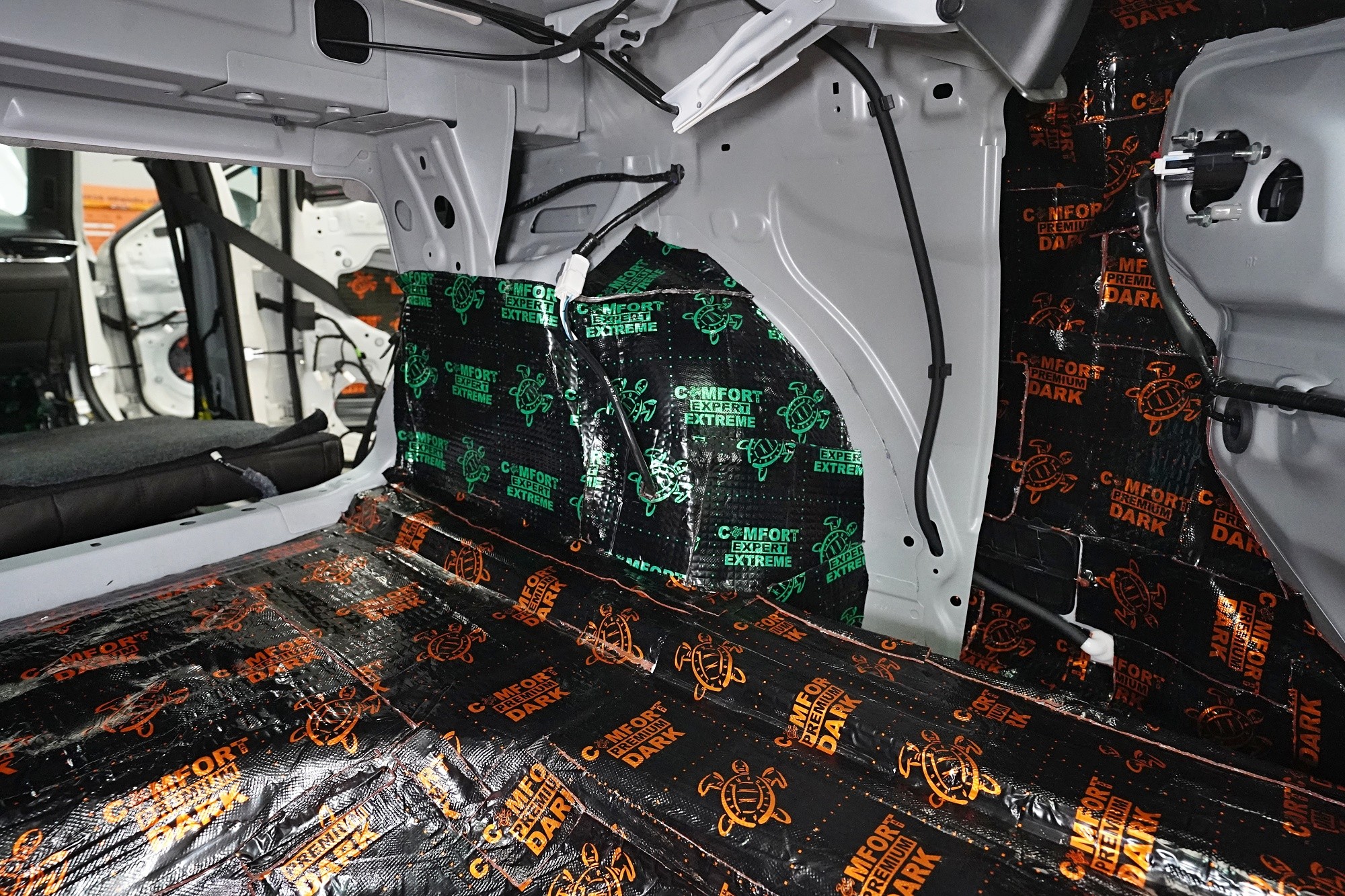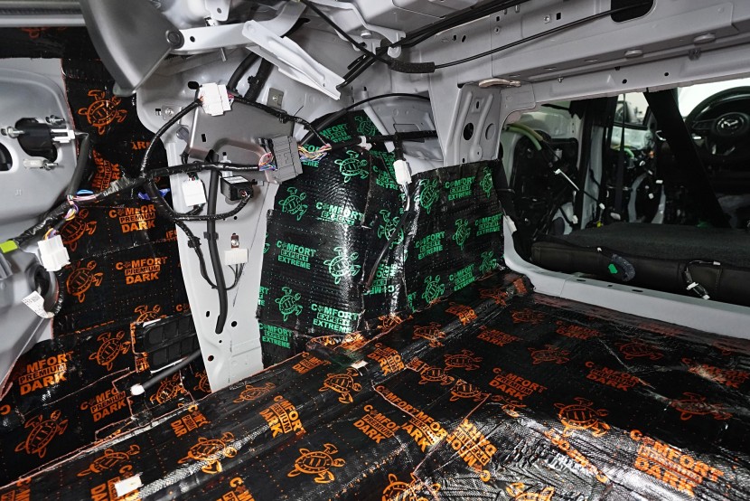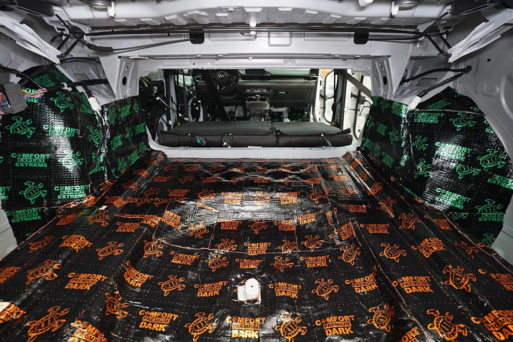 První fází instalace je odhlučnění podlahy, která je kvůli výrazným vibracím a hluku zejména o nízkých frekvencích v rámci celého vozu nejdůležitější. A právě proto u balíčku Expert Plus nově používáme profesionální antivibrační materiál Comfortmat Extreme, který při své tloušťce pouhých 3,5 mm poskytuje akustický ztrátový činitel (MLF) rekordních 0,63 jednotek. To z něj dělá nejúčinnější antivibrační materiál na trhu o tloušťce do 4 mm a perfektně se tedy hodí do našich instalací zaměřených na maximální účinnost. Na prostor pod zadními sedačkami jsme aplikovali antivibrační materiál Comfortmat Dark D3 o tloušťce 3 mm a MLF 0,41 jednotek, což je pro tuto oblast dostačující.