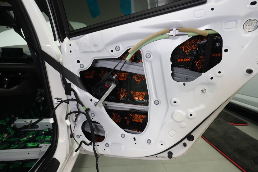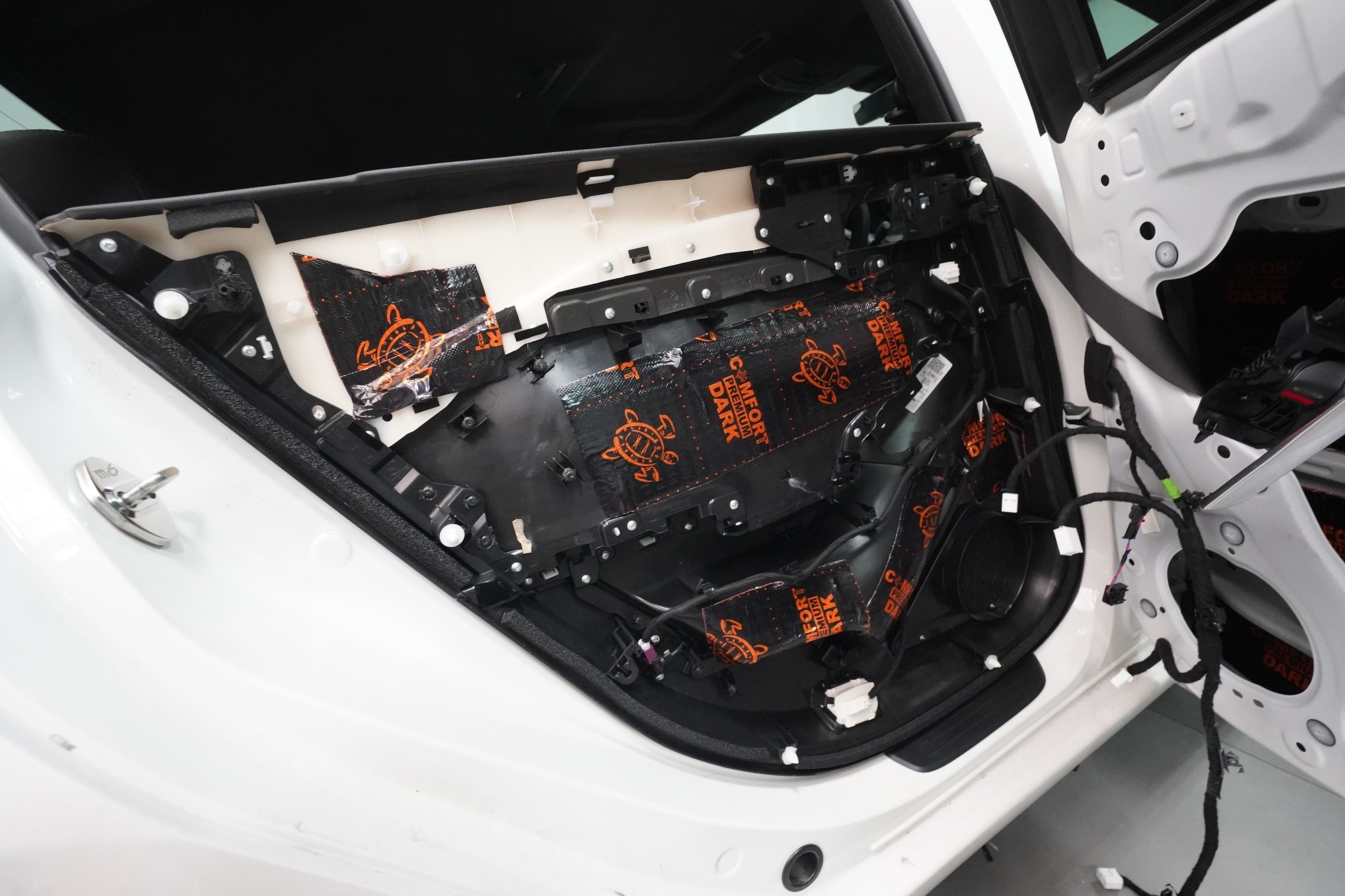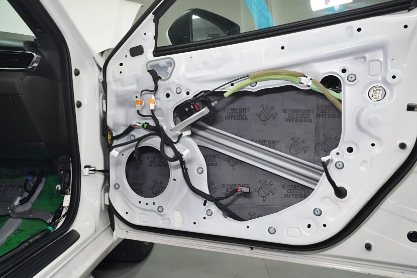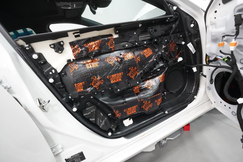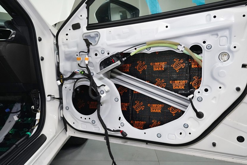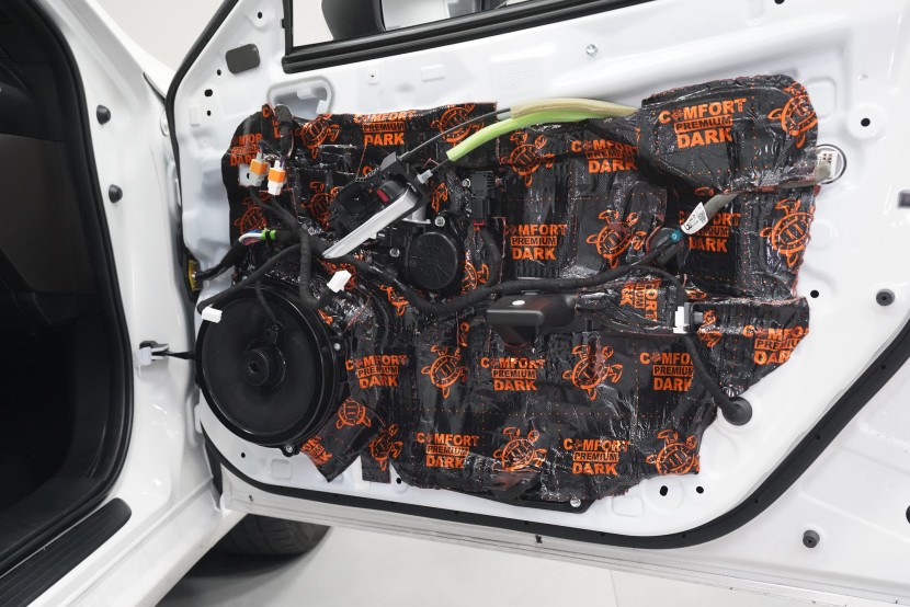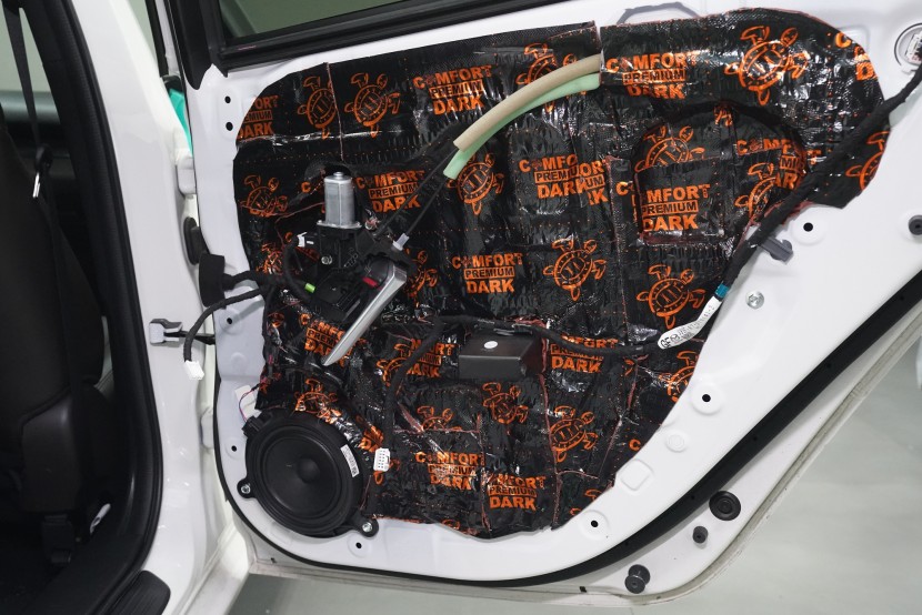 Následně aplikujeme taktéž odlehčený antivibrační materiál Comfortmat z prémiové řady Dark, tentokrát ve variantě 2,3 mm. Tato vrstva slouží k zamezení vibrací a rezonancí vnitřního plechu dveří a u většiny vozidel i k vytvoření uzavřené ozvučnice pro reproduktory, což má za následek zlepšení ozvučení. Zejména basová složka středobasového reproduktoru dozná podstatného zlepšení, což oceníte nejen u továrních reproduktorů.