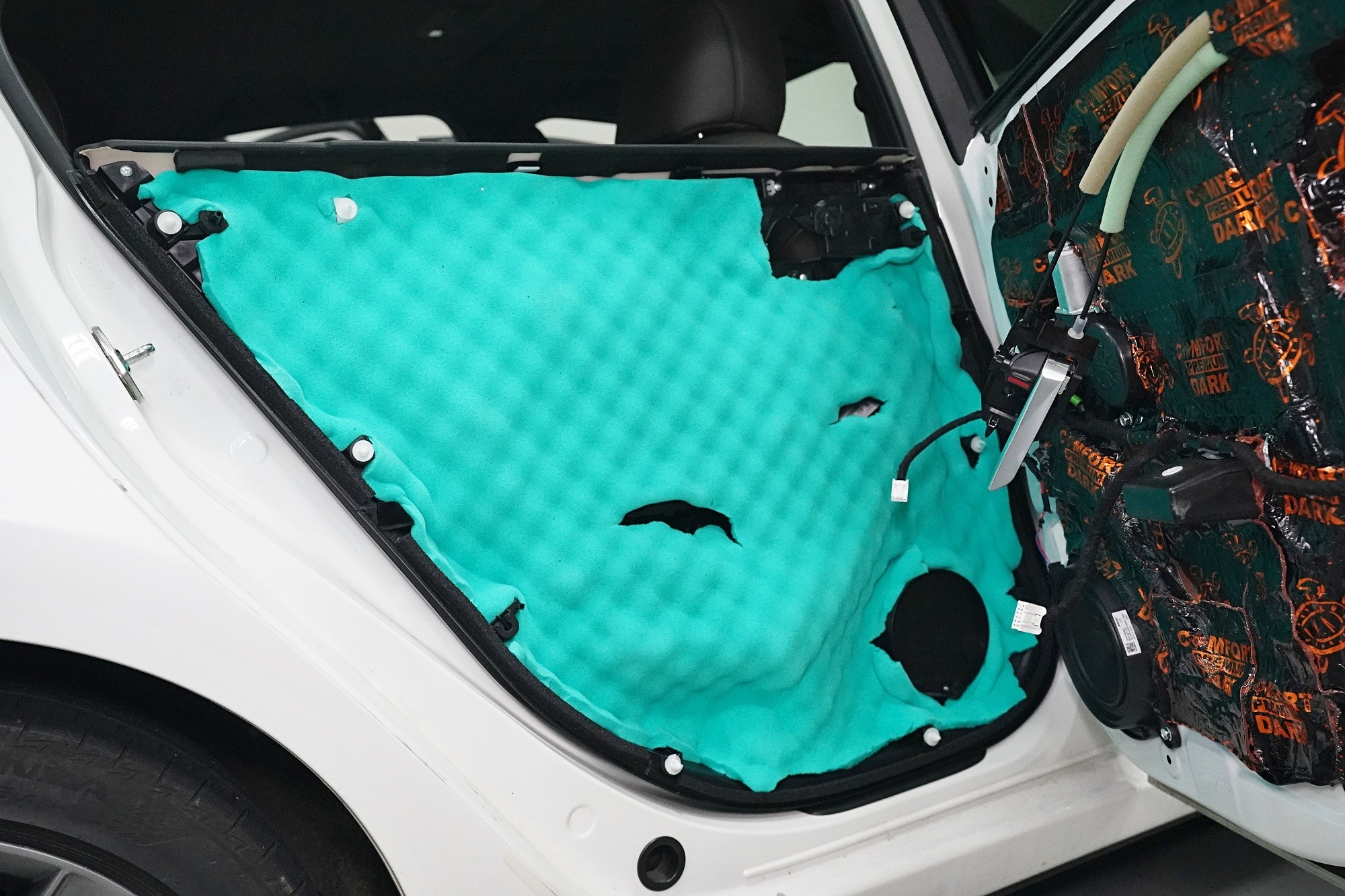 Finálně nalepíme na plastové obložení dveří Comfortmat Softwave Expert o tloušťce 15 mm. Tato flexibilní pěna s tvarovou pamětí se lepí na plastové čalounění dveří z důvodu zamezení skřípání a vrzání nejen plastů, ale i drátů a dalších komponent uvnitř dveří a dodatečně i sníží hluk této oblasti. Oproti klasické verzi materiálu Soft Wave je tato tyrkysová varianta vyrobena z hustější a účinnější polyuretanové pěny, která odhlučnění dveří posune na ještě vyšší úroveň. Stejný postup volíme i u zadních dveří.