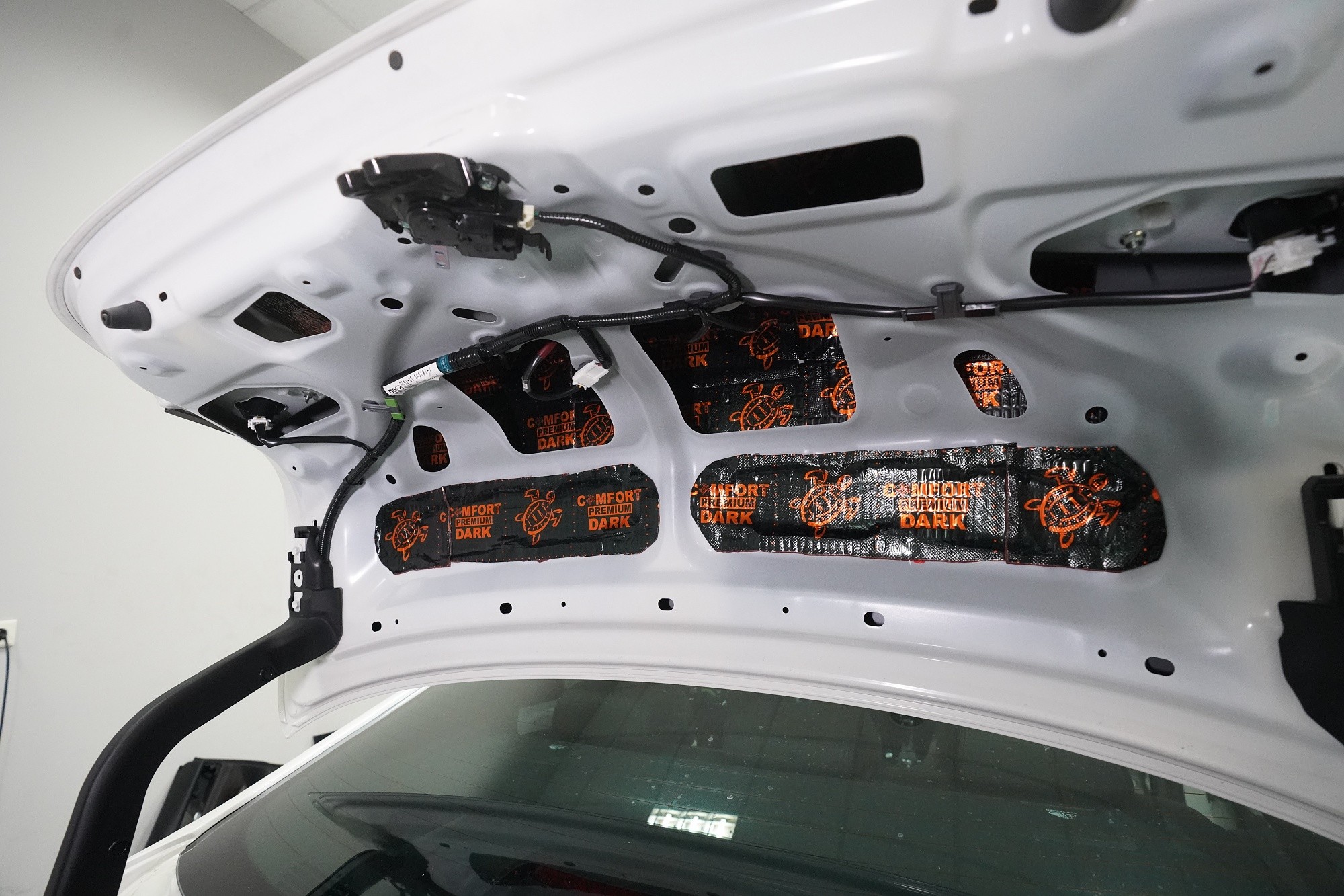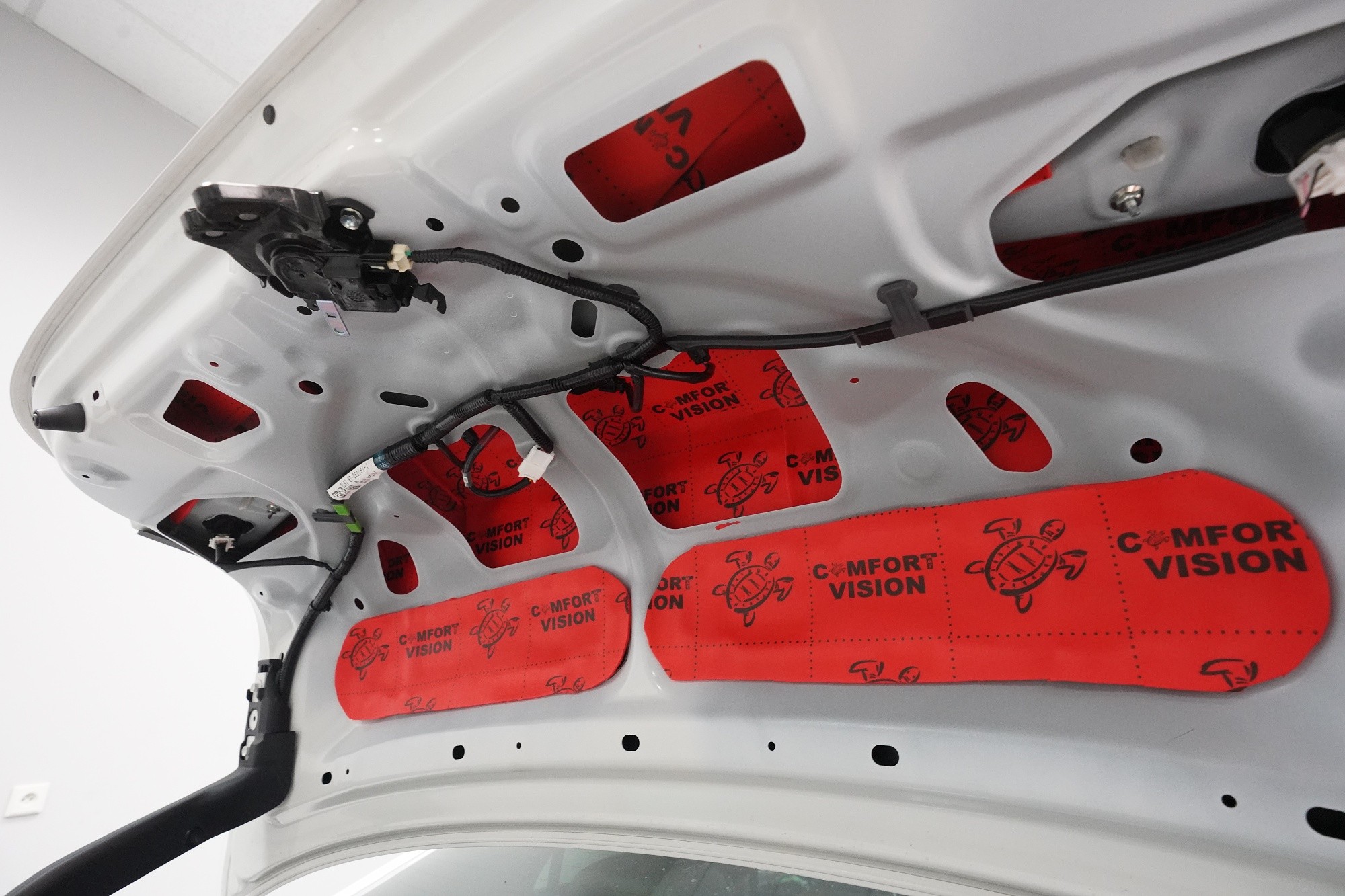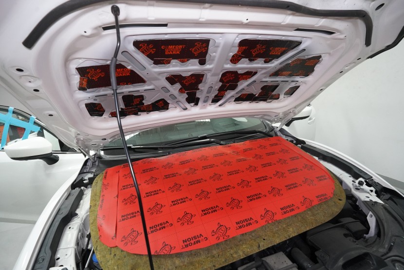 Nezapomínáme ani na kapotu, na kterou v první vrstvě aplikujeme opět lehký antivibrační materiál Comfortmat D2. Tím kapotu zpevníme, zamezíme vibracím, které se přenáší do dalších částí vozu a zmizí i typický plechový zvuk při zavření kapoty. Na originální kryt kapoty následně aplikujeme zvukově i tepelně izolační materiál Comfortmat Vision, který sníží hluk motoru a to při zachování původního vzhledu motorového prostoru. Tímto instalaci dokončujeme a brzy předáme vůz majiteli.