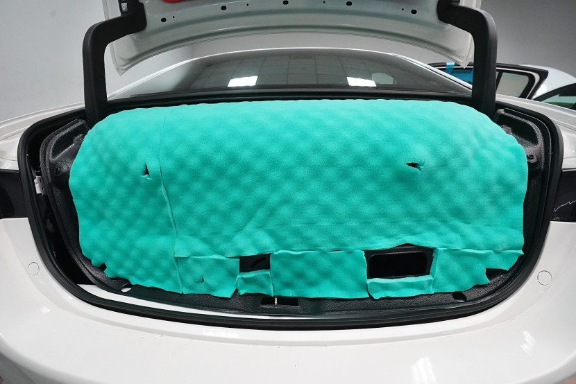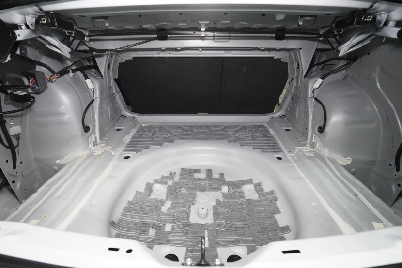 Zavazadlový prostor odhlučňujeme podobným způsobem, protože všudypřítomné vibrace a hluk zejména od pneumatik je nezbytné co nejvíce omezit. Na dno kufru aplikujeme stejný materiál jako pod zadní sedačky, tedy Comfortmat Dark D3 o tloušťce 3 mm a MLF 0,41. Ten nejen absorbuje veškeré vibrace, ale sníží i nízkofrekvenční hluk, který je typický pro tuto oblast.