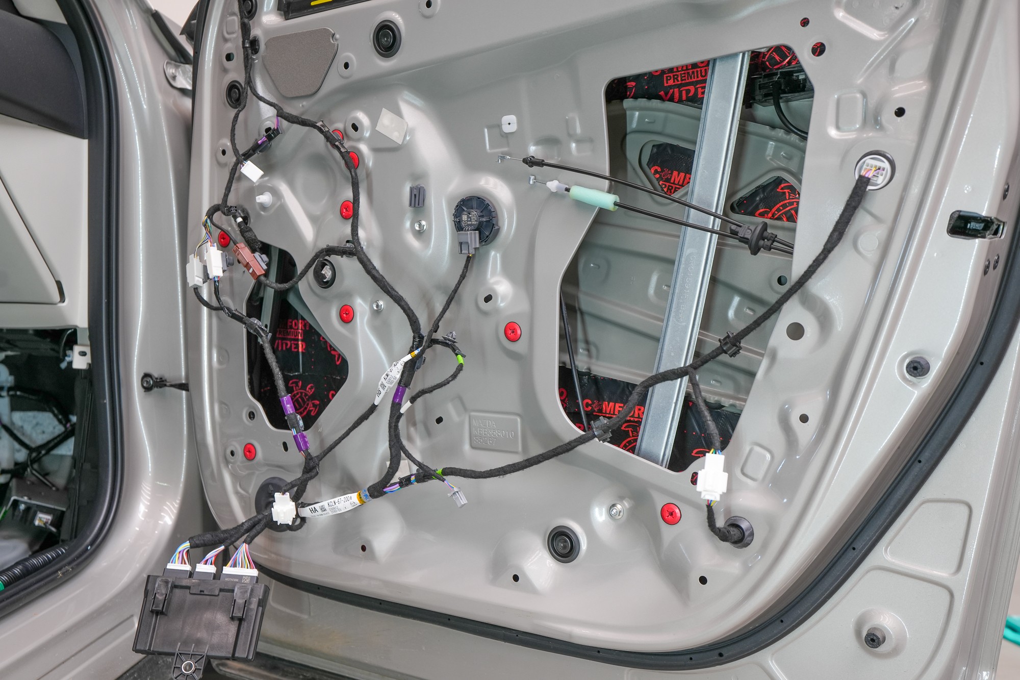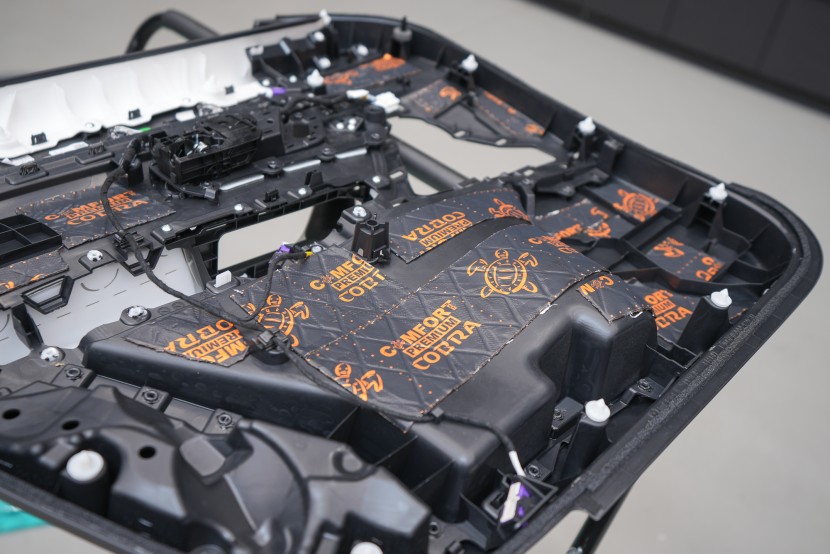 Dveře odhlučňujeme celkem v 5 vrstvách. V rámci balíčku Expert Plus volíme silnější antivibrační materiál na vnější plech dveří, konkrétně Comfortmat Viper o tloušťce 3 mm. Ten s přehledem zlikviduje vibrace, zamezí pronikání nízkofrekvenčního hluku a zpevní velmi tenký plech dveří. I přes vyšší tloušťku materiál disponuje velmi nízkou hmotností, je samozřejmě voděodolný a má mimo jiné antikorozní vlastnosti.
