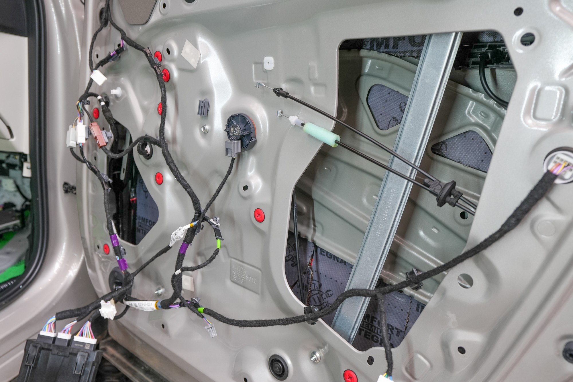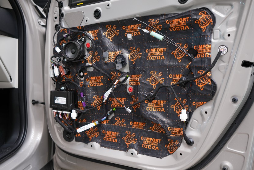 Následně aplikujeme antivibrační materiál Comfortmat Cobra, který se pyšní nejnižší hmotností ze všech antivibračních materiálů na trhu v dané tloušťce 2,3 mm. Tato vrstva slouží k zamezení vibrací a rezonancí vnitřního plechu dveří a u většiny vozidel i k vytvoření uzavřené ozvučnice pro reproduktory, což má za následek zlepšení ozvučení.