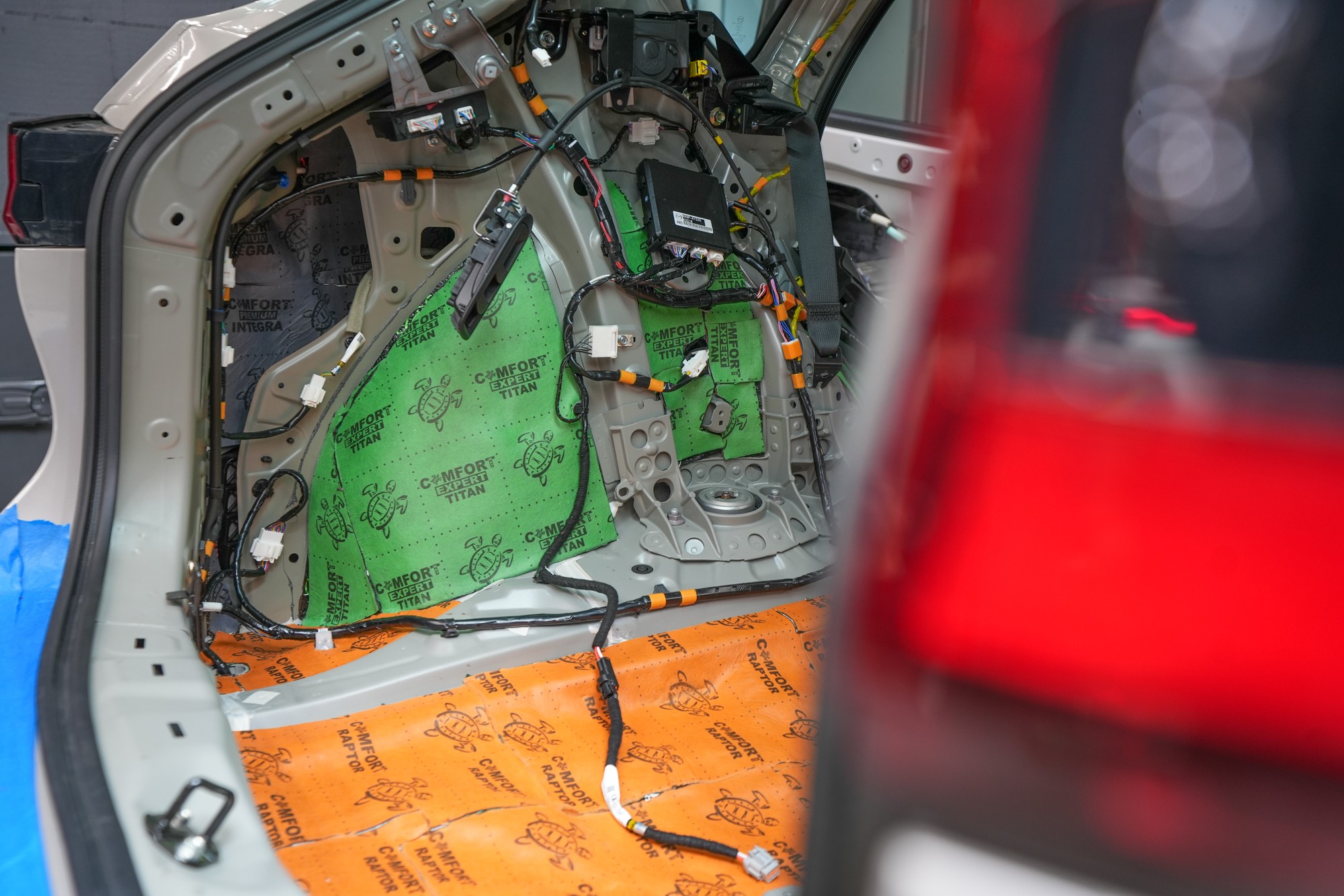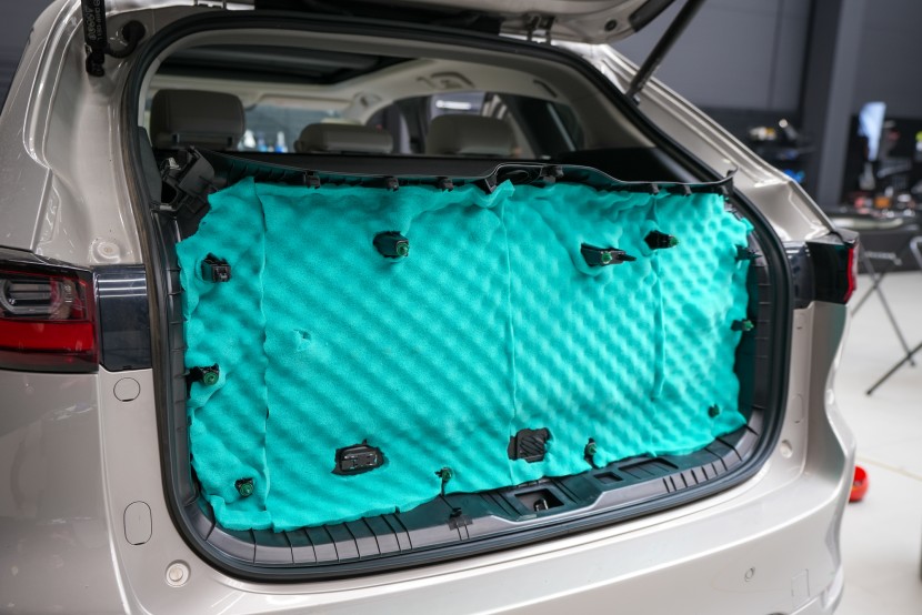 Zavazadlový prostor odhlučňujeme podobným způsobem, protože je nezbytné co nejvíce zamezit všudypřítomným vibracím a hluku od pneumatik pronikat do interiéru. A i proto volíme totožné materiály jako v případě odhlučnění podlahy. Na dno kufru aplikujeme stejný materiál jako pod zadní sedačky, tedy Comfortmat Viper o tloušťce 3 mm a MLF 0,49. Ten nejen absorbuje veškeré vibrace, ale sníží i nízkofrekvenční hluk, který je typický pro tuto oblast.
