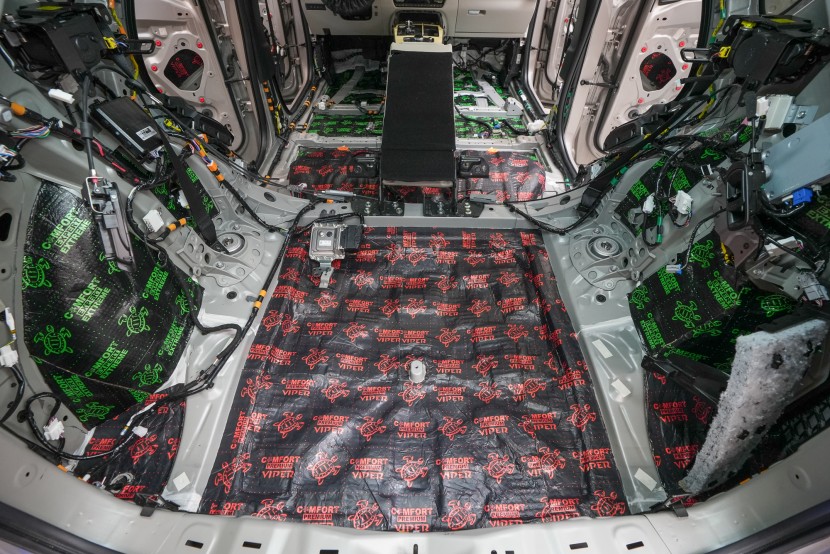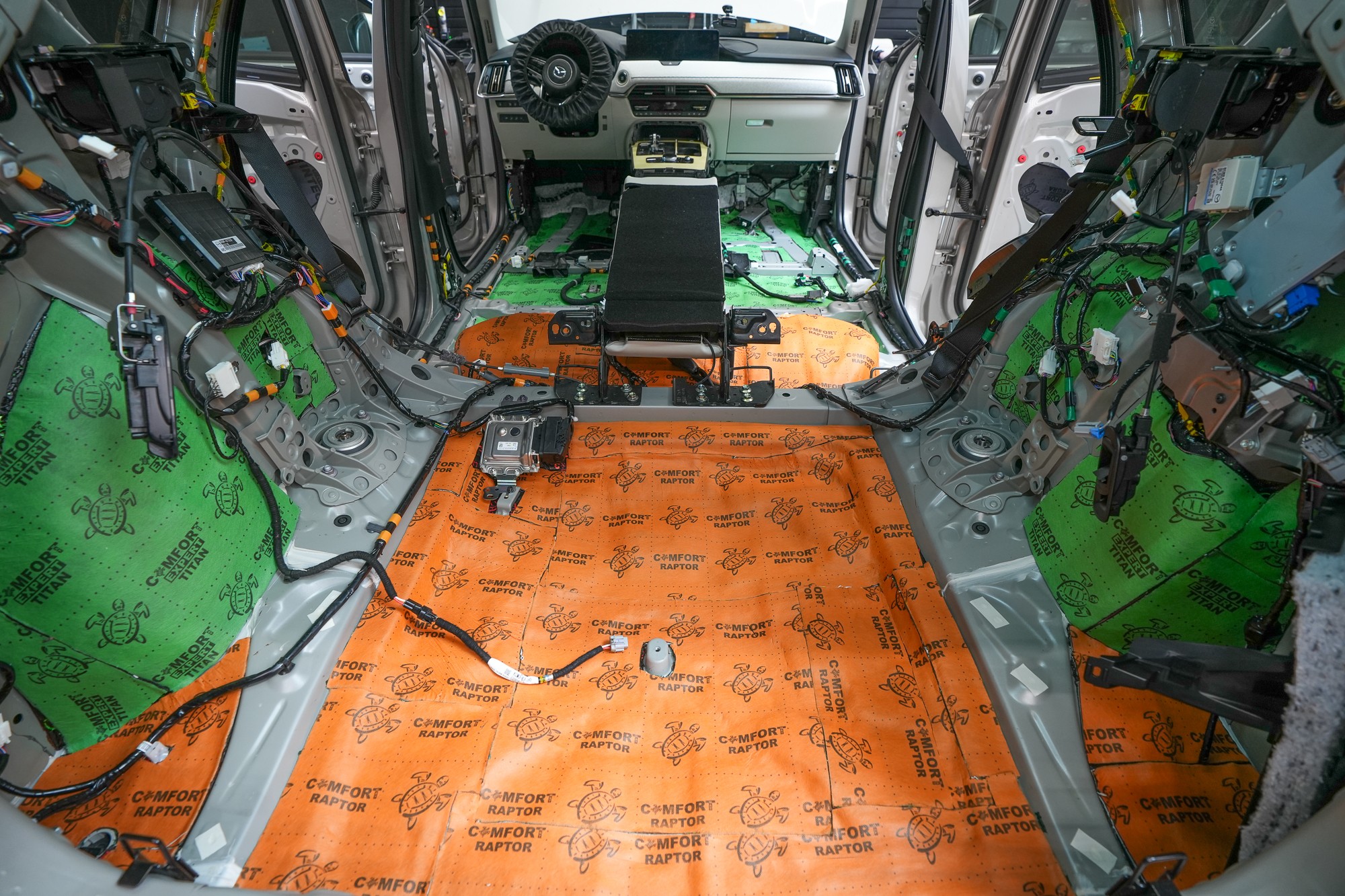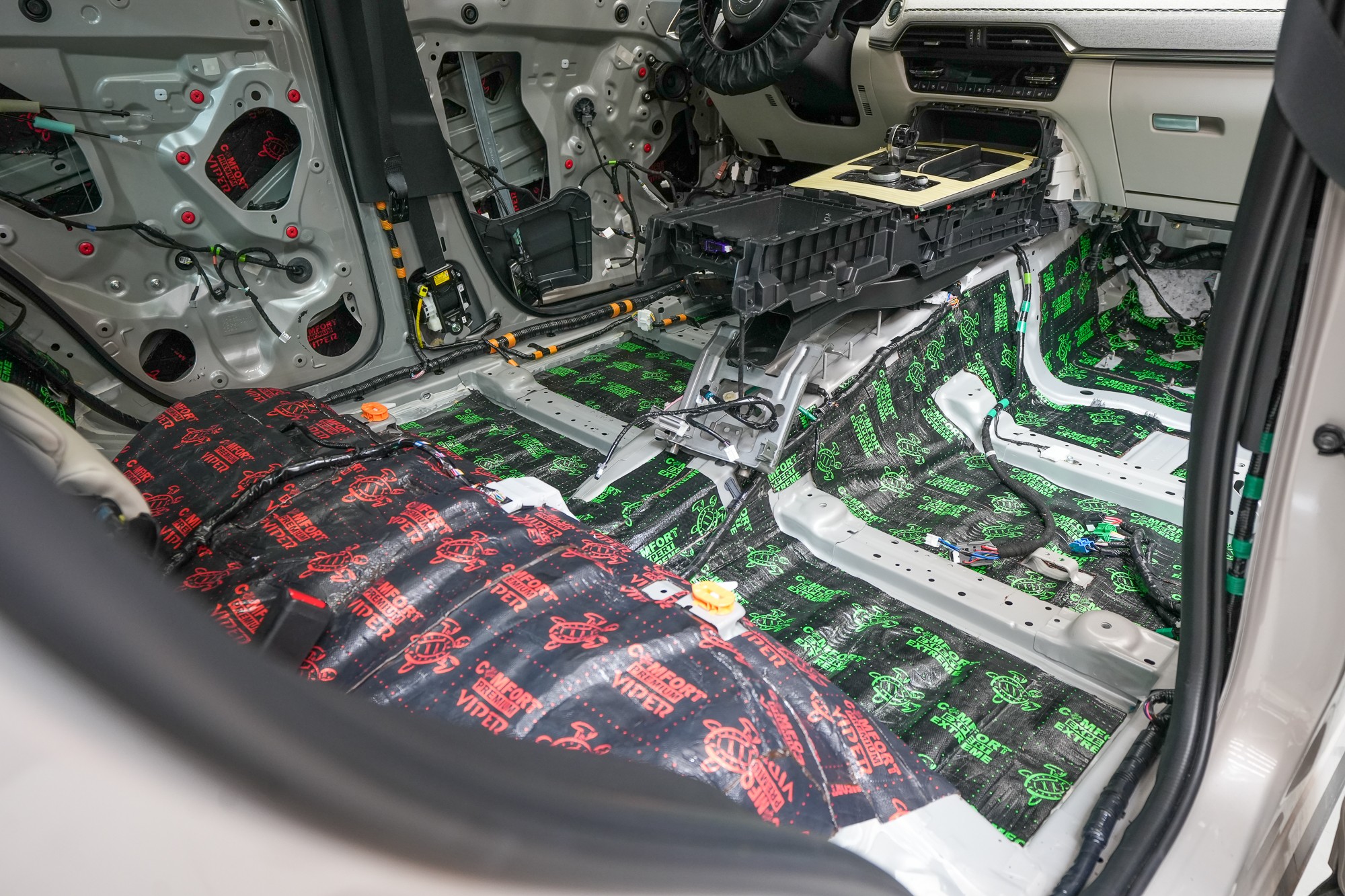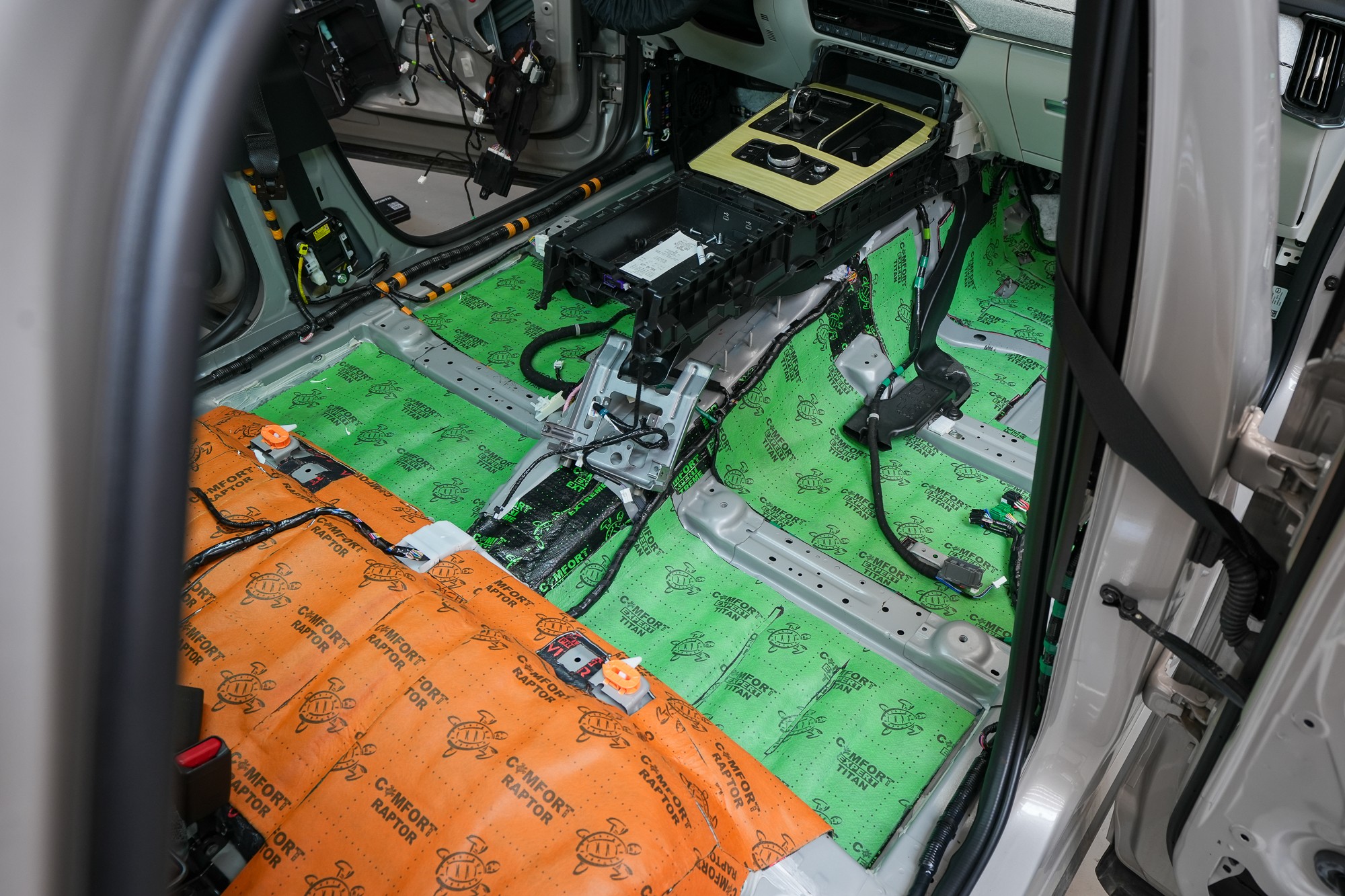 Zákazník se proto rozhodl pro odhlučnění vozu v rámci našeho balíčku Premium Plus, který nedávno prošel vylepšením. Nově jsme do něj zařadili zvukově izolační materiál Comfortmat Titan, který používáme pro podlahu a podběhy – tedy dvě nejvíce zatížené oblasti karoserie. Titan představuje díky schopnosti útlumu hluku až 38 dB nejúčinnější materiál současnosrti a jeho přínos je v praxi ihned patrný. Dvouvrstvé řešení kombinující materiály profesionální řady Expert umožňuje maximální možný účinek v rámci daného rozsahu odhlučnění.