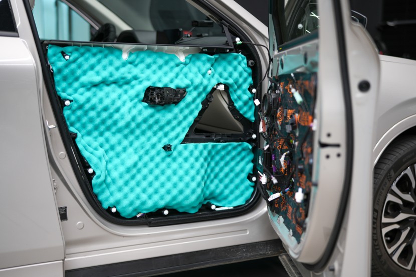 A konečně poslední vrstvou je Comfortmat Softwave Expert o tloušťce 15 mm, který jsme již aplikovali i ve druhé vrstvě na střeše. Tato flexibilní pěna s tvarovou pamětí se lepí na plastové čalounění dveří z důvodu zamezení skřípání a vrzání nejen plastů, ale i drátů a dalších komponent uvnitř dveří a dodatečně i sníží hluk této oblasti. Oproti klasické verzi materiálu Soft Wave je tato tyrkysová varianta vyrobena z hustější a účinnější polyuretanové pěny, která odhlučnění dveří posune na ještě vyšší úroveň. Stejný postup volíme i u zadních dveří.