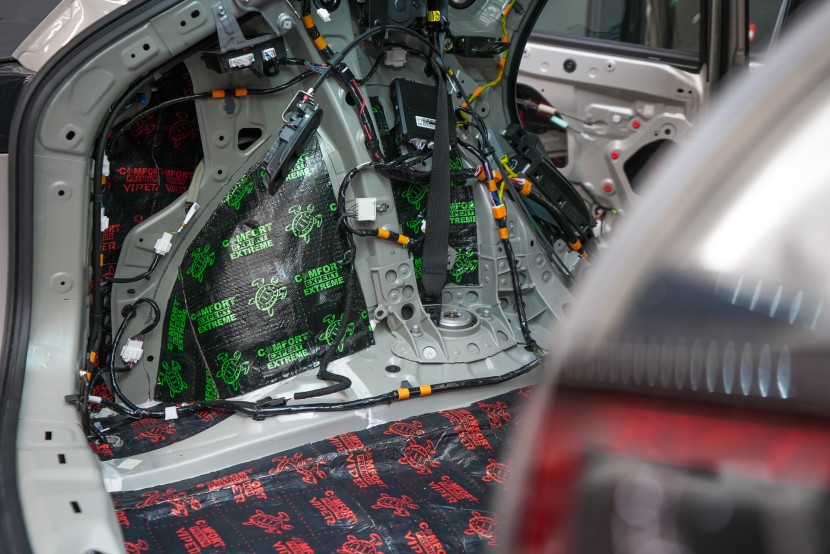 Zadní podběhy opatříme stejným zvukově izolačním materiálem, jaký jsme použili i na odhlučnění podlahy. Comfortmat Titan se vyznačuje rekordní schopností zvukové izolace a kde jinde tento materiál použít, než na zadní podběhy. Nezapomínáme ani na blatníky, na které aplikujeme lehký membránový materiál Comfortmat Integra. Tento materiál využíváme i při odhlučnění dveří, kde ještě více vyniknou jeho vlastnosti.