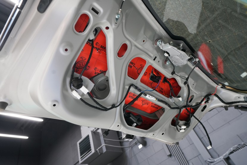 Věnujeme se samozřejmě i pátým dveřím, aby odhlučnění zavazadlového prostoru bylo kompletní. Jako první vrstvu volíme lehký antivibrační materiál Comfortmat Dark D2 o tloušťce 2,3 mm, který zamezí vibracím a nezatěžuje páté dveře zbytečnou hmotností.