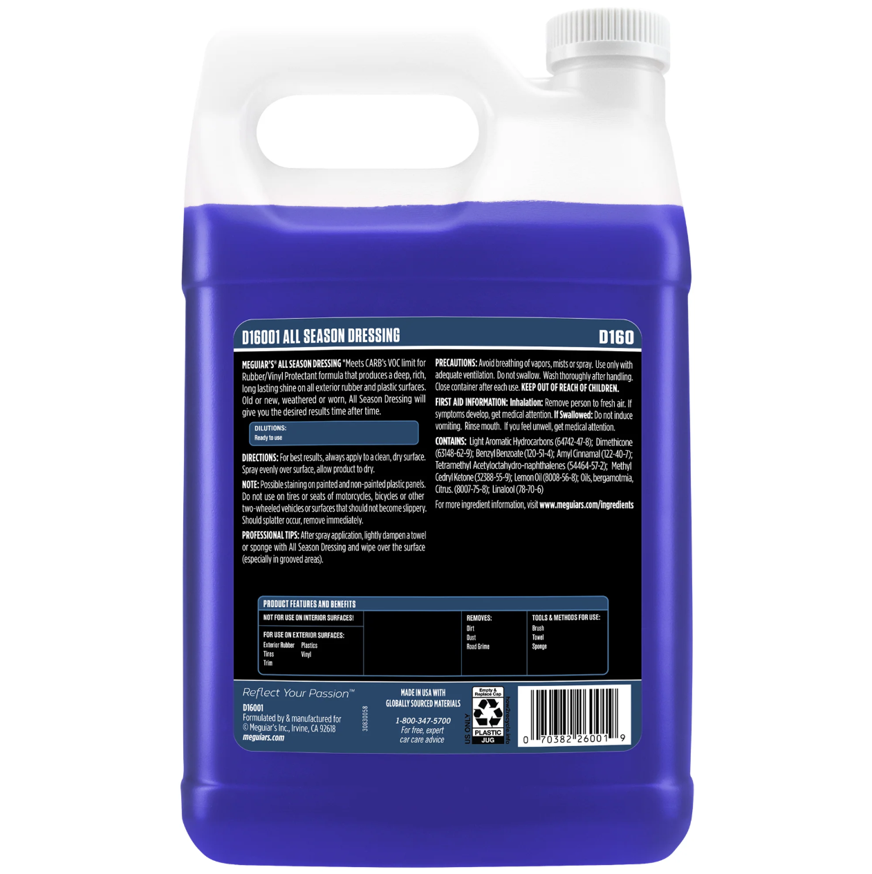 Meguiar’s All Season Dressing je profesionální formulace navržená pro ošetření plastových, vinylových a gumových částí vozidla jak v interiéru, tak exteriéru, a to nezávisle na ročním období či teplotě. Jeho vysoká stabilita znamená, že nezápasí s extrémními podmínkami - od horkého slunce po mrazivé zimy. Vyživuje materiál, obnovuje jeho vzhled, zanechává rovnoměrný saténový nebo matný finiš dle volby a chrání proti UV záření i stárnutí. Profesionální balení 1 galon zajišťuje velkou kapacitu pro dílny, fleet vozidla či pravidelné použití.