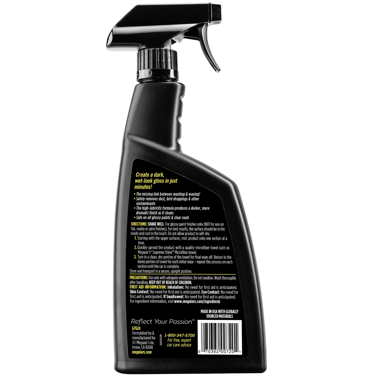 Meguiar’s Gold Class Premium Quik Detailer je výkonný přípravek pro rychlou údržbu laku - ideální pro odstranění prachu, otisků prstů, zaschlých kapek či lehkých nečistot bez nutnosti kompletního mytí. Tento detailer je speciálně formulován pro tmavé a černé laky, kde zvýrazní hloubku barvy a dodá efekt „mokrého“ lesku. Je bezpečný pro použití na všech lesklých lacích včetně moderních čirých vrstev, neobsahuje hydrofobní polymerní technologii, ale nabízí nejtmavší „mist & wipe“ efekt v řadě, čímž „černým vozům“ dodává skutečně dramatický vzhled.