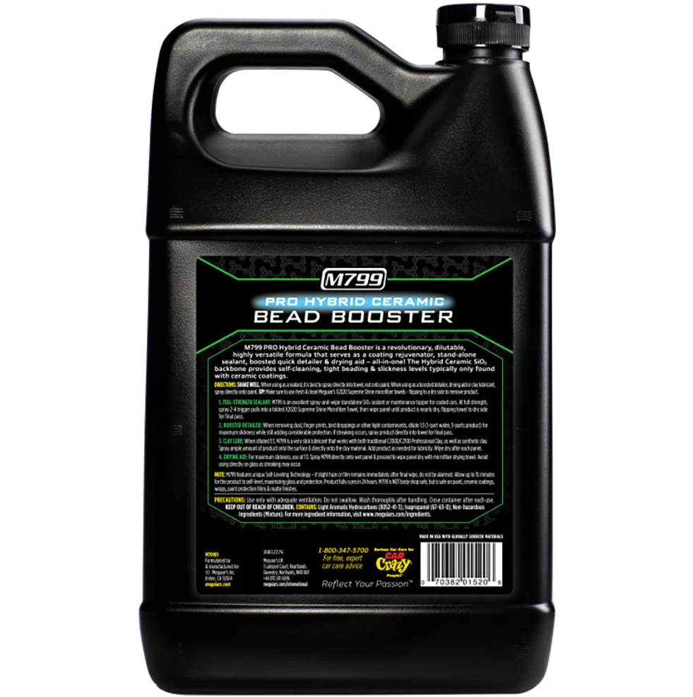Meguiar’s M799 Pro Hybrid Ceramic Bead Booster je vysoce výkonný univerzální přípravek navržený pro zvýšení a prodloužení ochrany automobilového laku a jeho povrchových vrstev. Hybridní keramické složení (SiO₂) poskytuje vynikající odolnost proti vodě, nečistotám i silniční špíně, zanechává povrch extrémně hladký, s výrazným vysokým leskem a výbornou schopností „korálkování“ vody. Produkt lze využít mnoha způsoby - jako samostatný spray sealant, jako údržbový detailer mezi aplikacemi větší ochrany, jako sušicí pomoc při mytí či jako lubrikant při použití s clay barem. Je ideální pro profesionální použití i pro náročné nadšence péče o vozidlo.