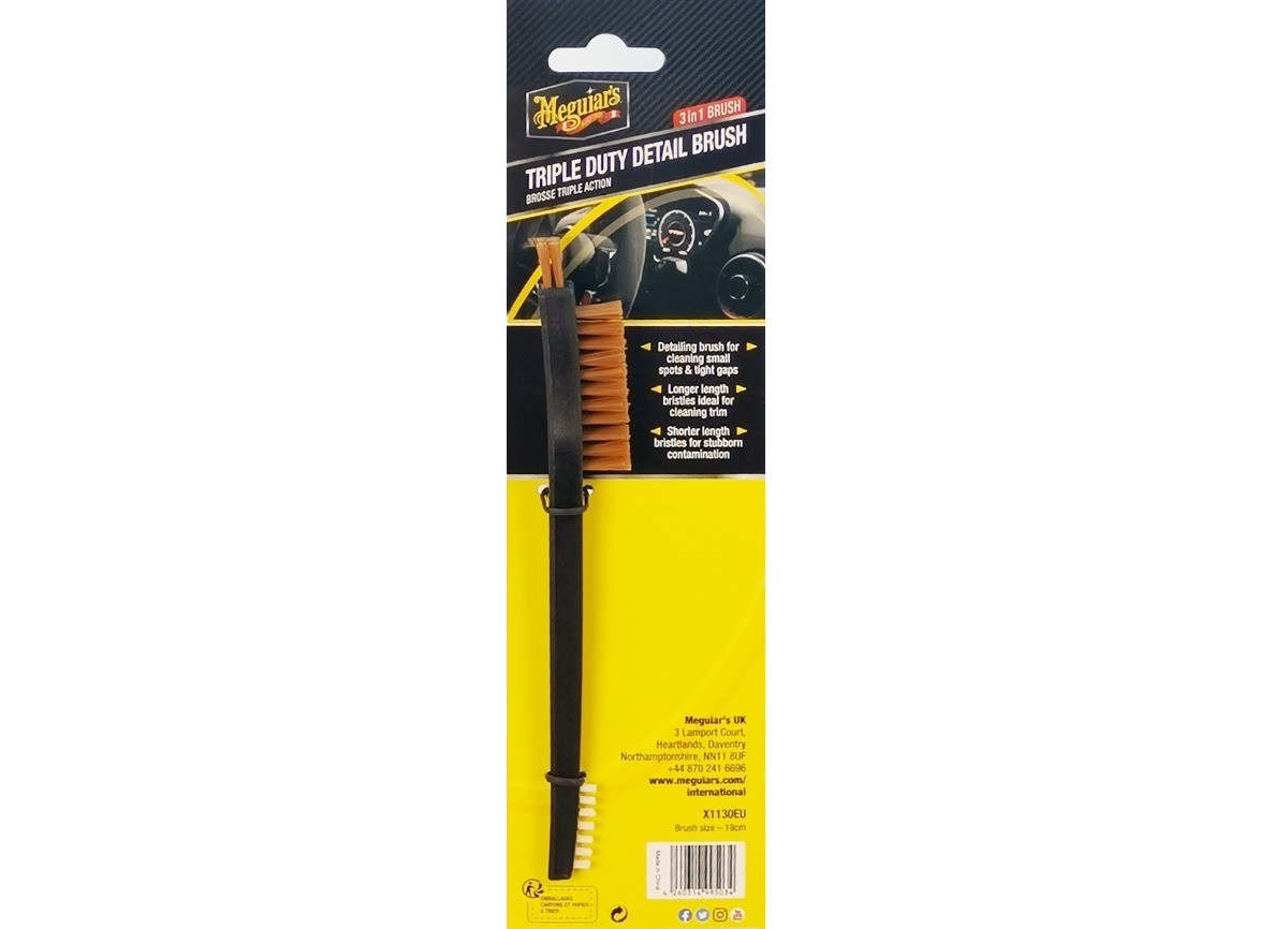 Meguiar’s Triple Duty Detail Brush je všestranný kartáček navržený pro detailní čištění automobilu - jak interiéru, tak exteriéru. Díky měkkým syntetickým štětinám dosahuje precizního výsledku při čištění výdechů ventilace, štěrbin mezi panely, spár, kolem loga, chromu i plastových lišt. Ergonomická rukojeť zajišťuje jistý úchop a snadnou manipulaci i v těžko dostupných místech. Tento kartáček je ideální jak pro detailery, tak pro domácí nadšence, kteří hledají nástroj na drobné detaily, které běžné utěrky nebo rukavice nezvládnou.