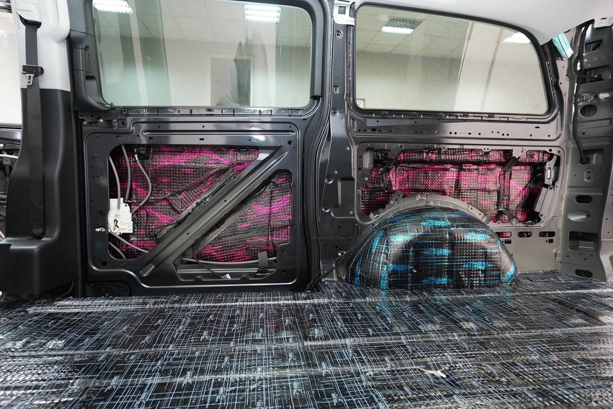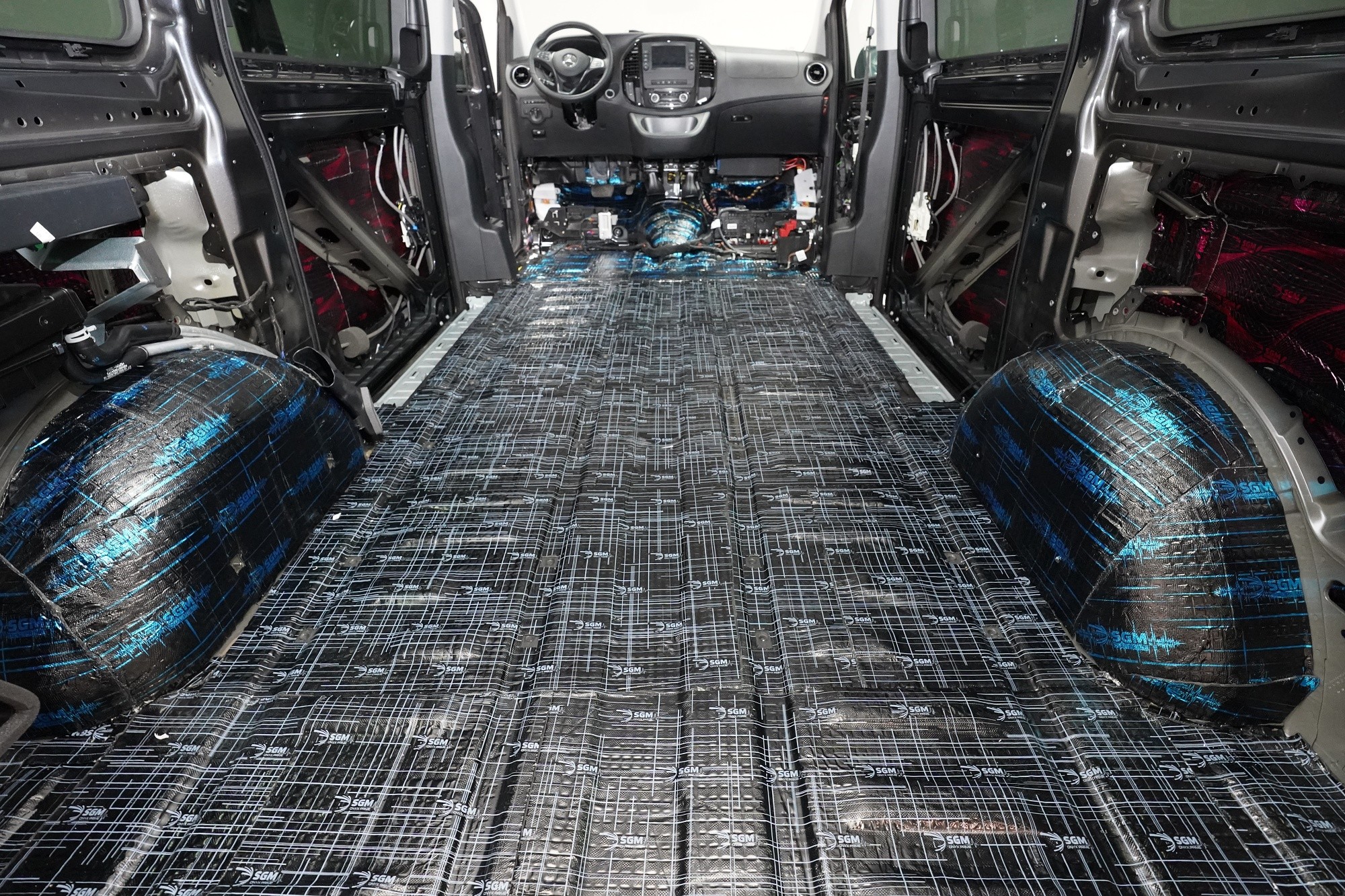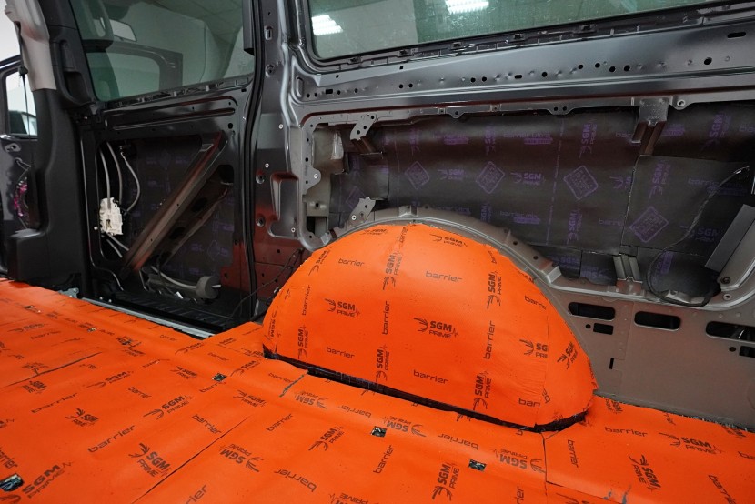 Na blatníky a posuvné dveře aplikujeme odlehčený antivibrační materiál SGM Air 3, který se pyšní nejen velmi nízkou hmotností, ale vysokým ztrátovým činitelem 0,42 jednotek. A konečně zadní podběhy opatříme stejně jako podlahu nejlepším z nejlepších - SGM Dual Prime. Vibrace a nízkofrekvenční hluk od pneumatik i létajících kamínků již nemá žádnou šanci a jdeme na druhou vrstvu.