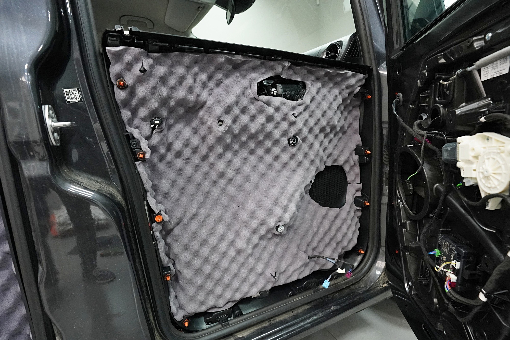 I páté dveře opatřujeme poslední vrstvou, kterou je materiál SGM Violon Wave o tloušťce 15 mm. Tato flexibilní pěna s tvarovou pamětí se lepí na plastové čalounění dveří z důvodu zamezení skřípání a vrzání nejen plastů, ale i drátů a dalších komponent uvnitř dveří a dodatečně i sníží hluk této oblasti.