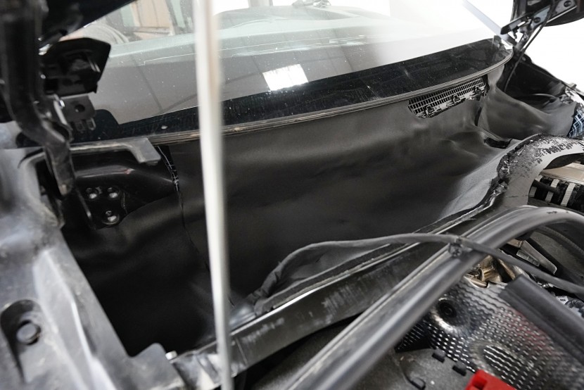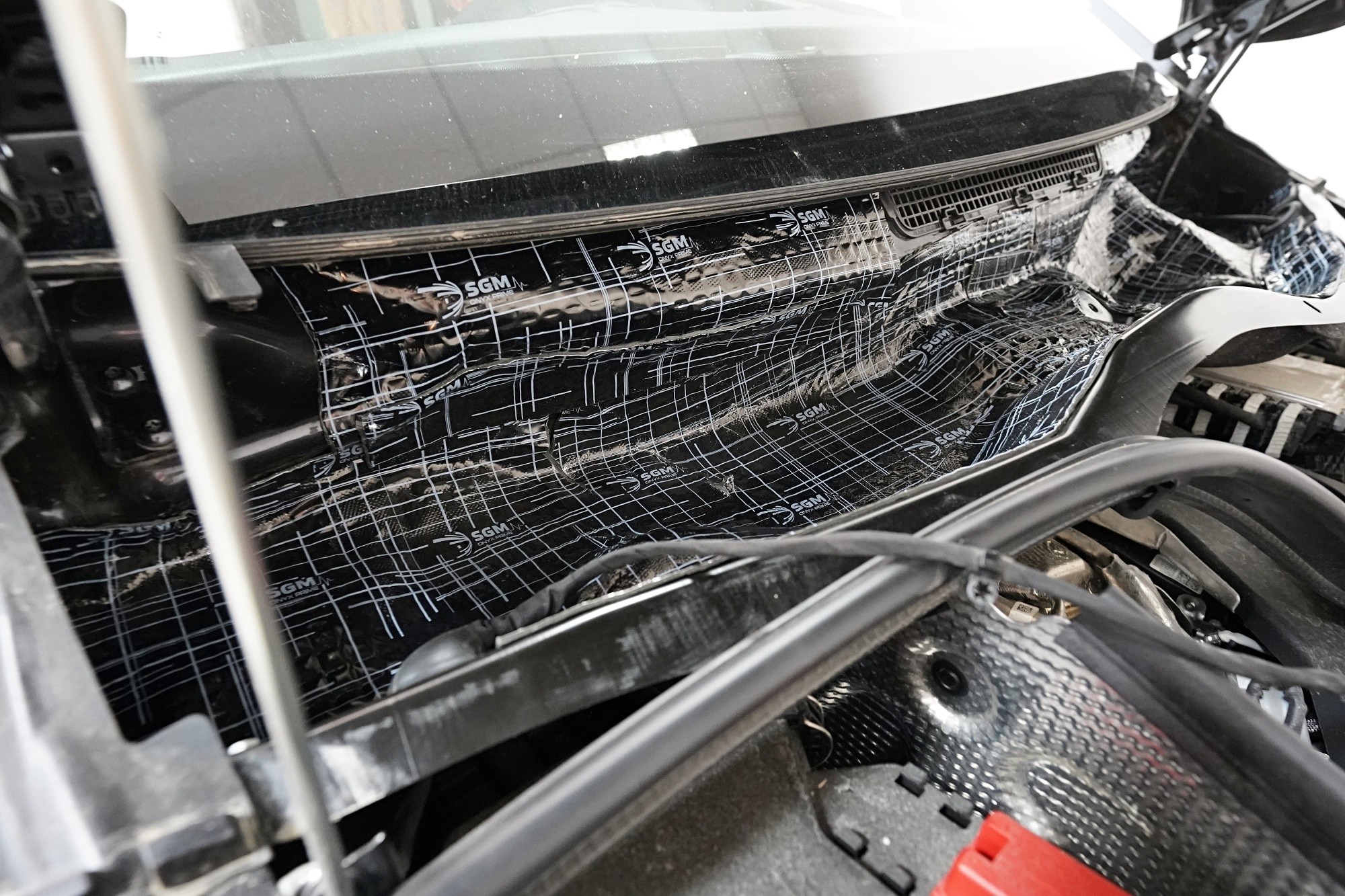 Také odhlučnění torpéda může přinést zajímavé výsledky. Stěrače jsou zdrojem silných vzduchových turbulencí a prostor pod spodním okrajem čelního skla je často veliký. Vytváří se zde efekt zvuku v jeskyni a to v bezprostřední blízkosti interiéru. Druhým důvodem k odhlučnění torpéda je snížení hluku od motoru. Nejprve tradičně aplikujeme antivibrační materiál, konkrétně SGM Onyx 3, který odfiltruje silné vibrace motoru.