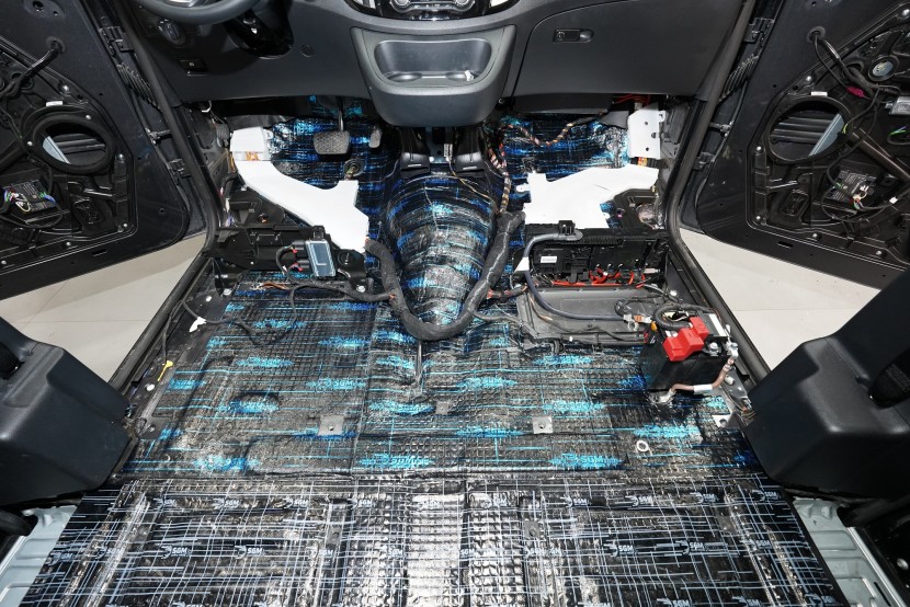 Začínáme podlahou vozu, kterou odhlučňujeme 2 vrstvami a trochu jiným způsobem než u jiných vozů tohoto typu. Zejména zadní část je prostorově velmi stísněná a je nezbytné zvolit materiály s menší tloušťkou. Začínáme ale přední částí podlahy, na kterou jsme v první vrstvě aplikovali momentálně nejúčinnější antivibrační materiál na trhu o tloušťce 4 mm a to SGM Dual Prime. Ten se pyšní akustickým ztrátovým činitelem (MLF) o hodnotě 0,66 jednotek a velmi snadnou aplikací, při které není nutné materiál nahřívat. Dual s přehledem odfiltruje vibrace této oblasti od motoru, převodovky nebo zavěšení kol a eliminuje pronikání nízkofrekvenčního hluku.