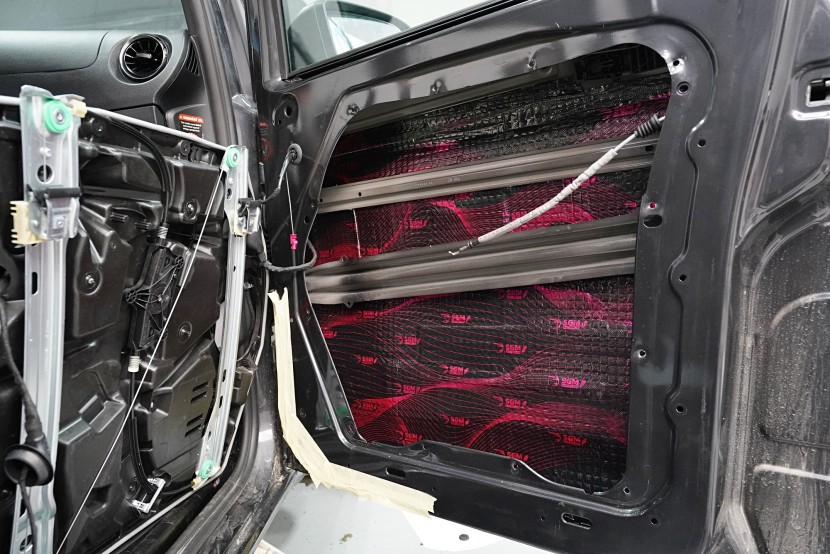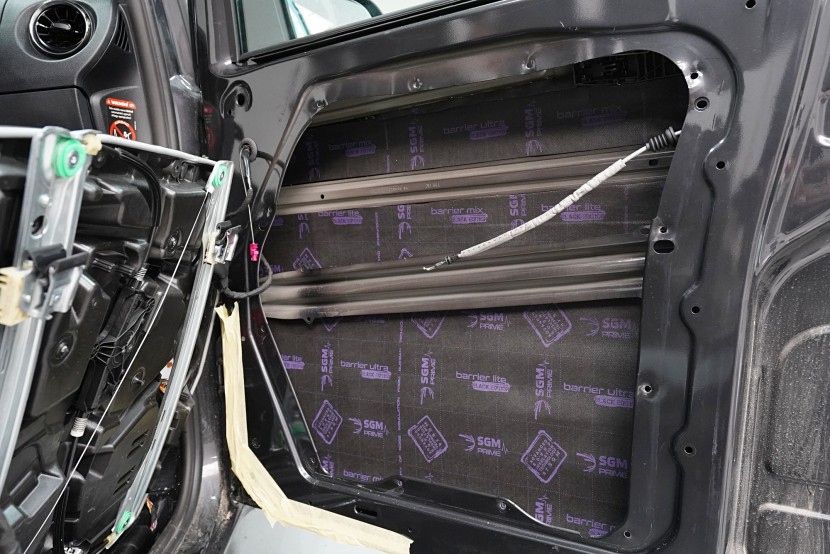 V rámci balíčku Expert Plus volíme jako první vrstvu při odhlučnění dveří antivibrační materiál SGM Air 3 o tloušťce 3 mm a MLF 0,42 jednotek. Ten s přehledem zlikviduje vibrace, zamezí pronikání nízkofrekvenčního hluku a zpevní velmi tenký plech dveří. I přes tloušťku 3 mm materiál disponuje velmi nízkou hmotností, je samozřejmě voděodolný a má mimo jiné antikorozní vlastnosti.