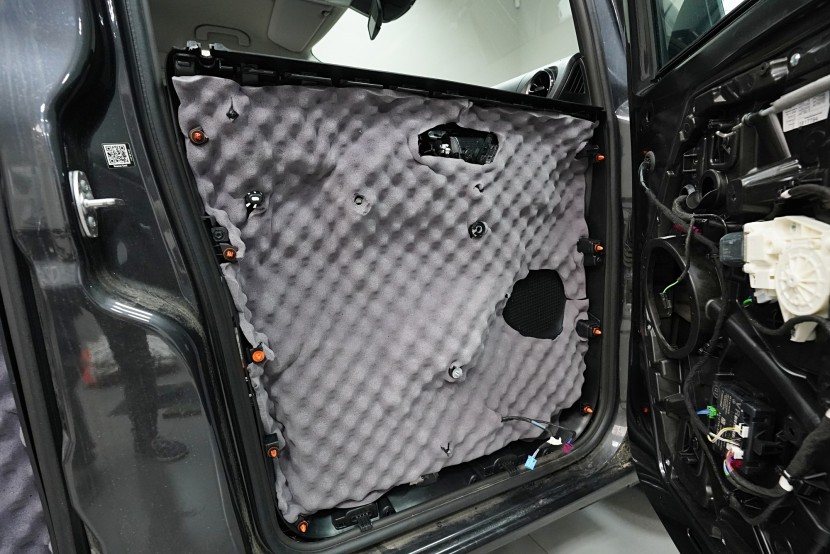 Poslední vrstvou je SGM Violon Wave o tloušťce 15. Tato flexibilní pěna s tvarovou pamětí se lepí na plastové čalounění dveří z důvodu zamezení skřípání a vrzání nejen plastů, ale i drátů a dalších komponent uvnitř dveří a dodatečně i sníží hluk této oblasti. Stejný postup samozřejmě volíme i u bočních a pátých dveří.